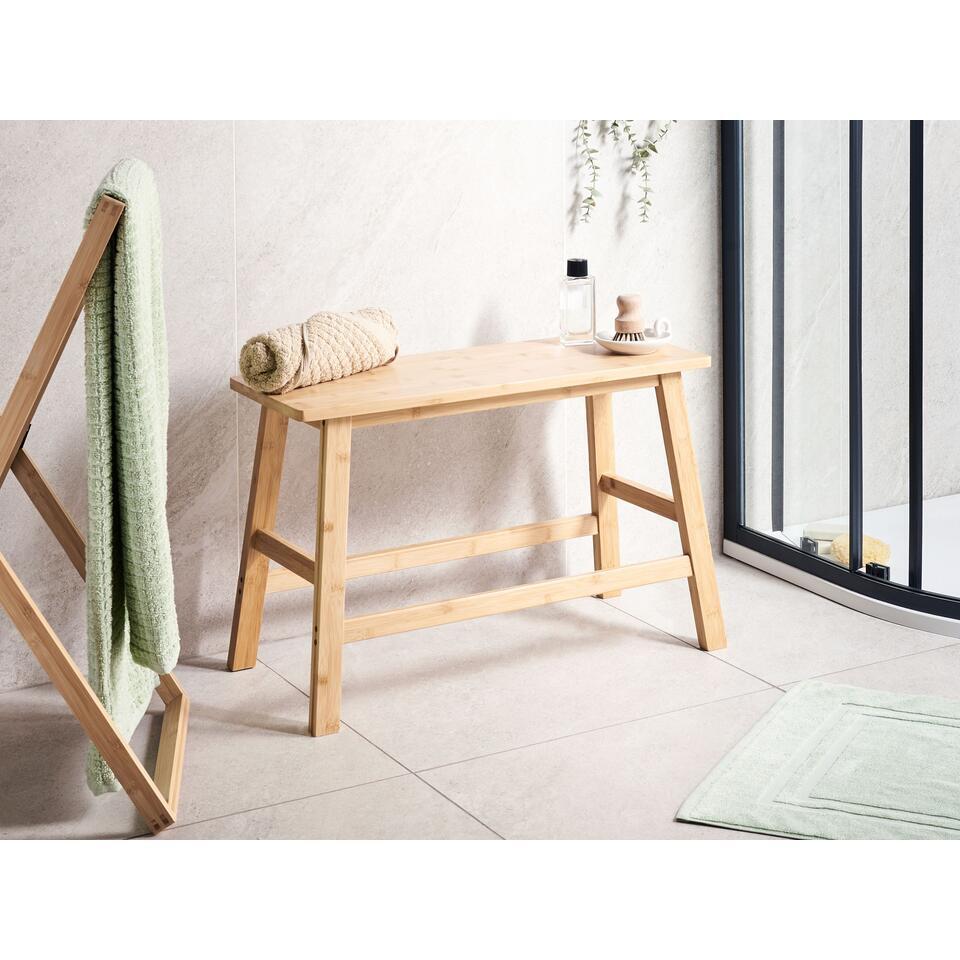 Houten badkamer kruk. Dit natuurlijke bamboe bankje biedt een praktische en strakke oplossing voor je badkamer. Met zijn minimalistische ontwerp biedt het een handige plek voor je accessoires terwijl het een warme, organische touch toevoegt. Een slimme keuze voor wie zowel functionaliteit als stijl zoekt in zijn ruimte.