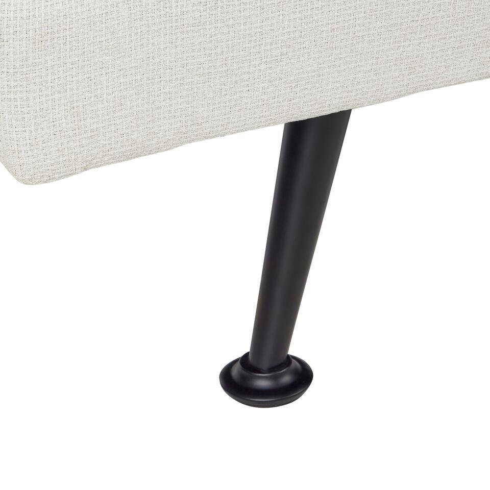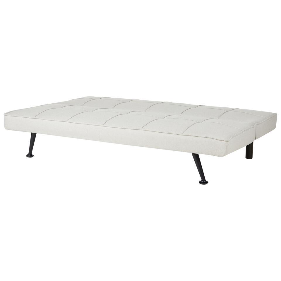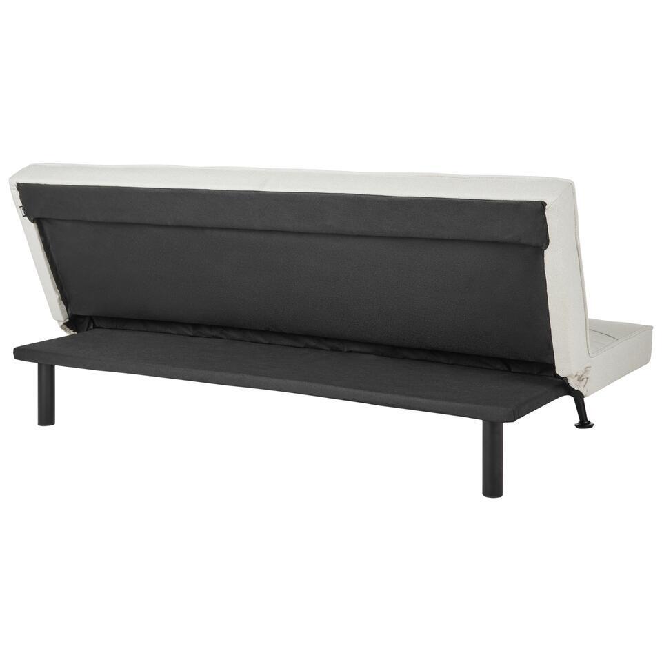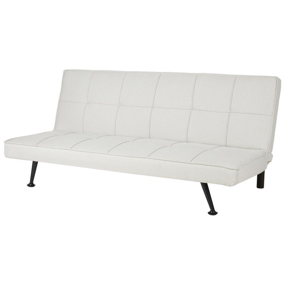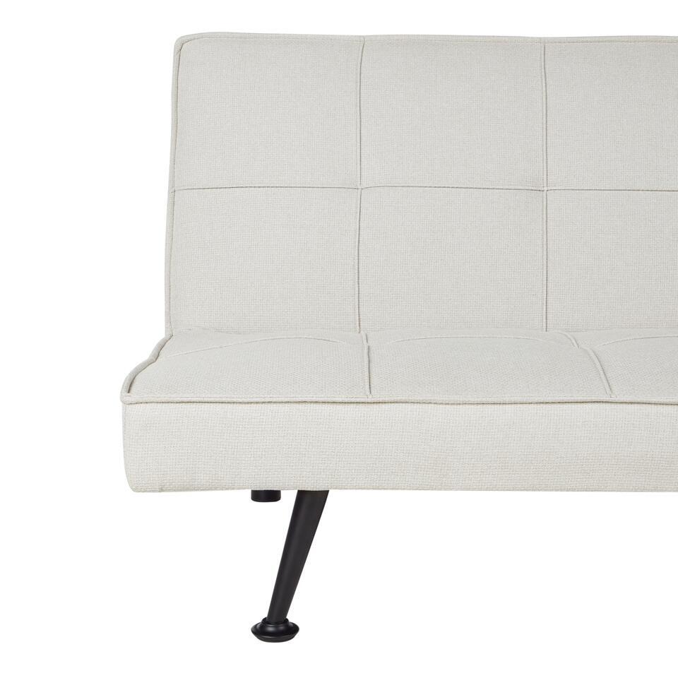 Moderne slaapbank in lichtbeige. Deze stoffen bank is een stijlvolle toevoeging aan elk modern of minimalistisch interieur. Overdag is het een ideale plek om te relaxen of om in te dommelen na een lange werkdag. 's Nachts kan hij gebruikt worden als comfortabele slaapplek. Dankzij de verstelbare rugleuning is hij binnen enkele seconden om te bouwen tot een slaapbank. Hij is bekleed met duurzaam polyester, en de zitting en rugleuning zijn subtiel getuft. Zwarte metalen poten accentueren het moderne ontwerp.
