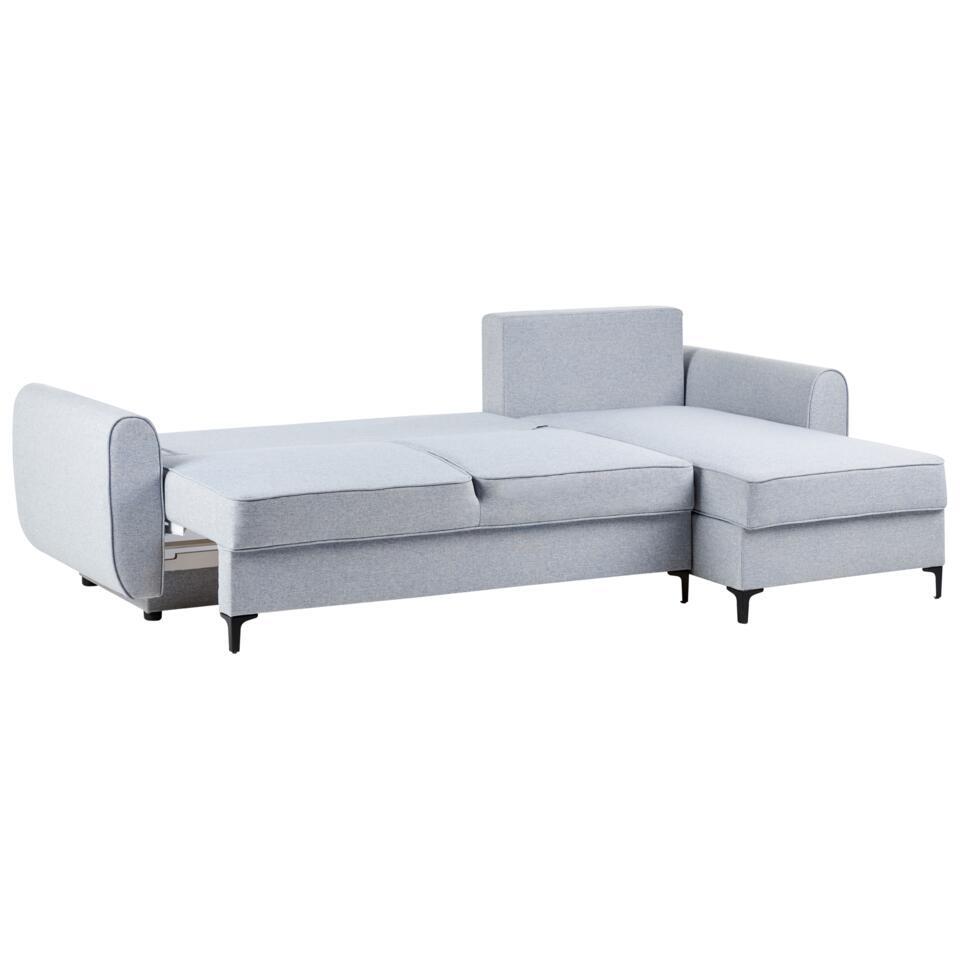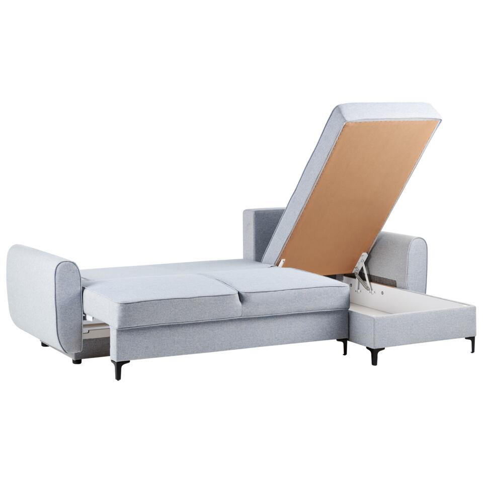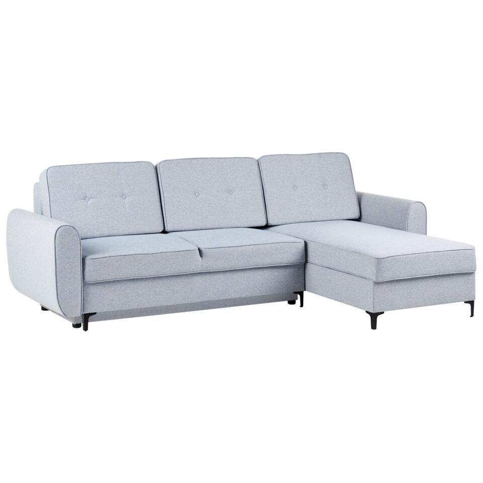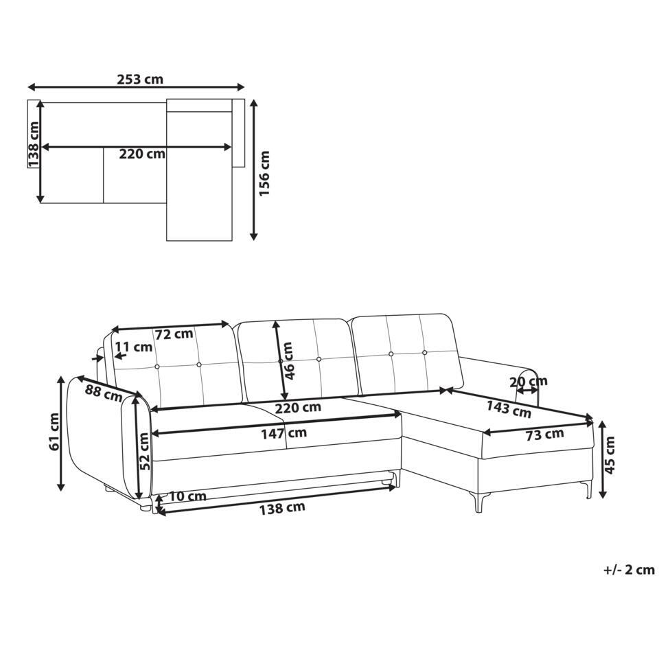 Gestoffeerde slaapbank met opbergruimte. Deze strakke hoekbank, bekleed met duurzame polyester stof, biedt een perfecte mix van stijl en functionaliteit. De bank is ontworpen met een ruim opbergvak en een slaapbankfunctie en kan gemakkelijk worden omgetoverd tot een comfortabele slaapplaats voor gasten. De strakke lijnen en getufte details zorgen voor een modern tintje, waardoor het een ideaal middelpunt is voor moderne interieurs.