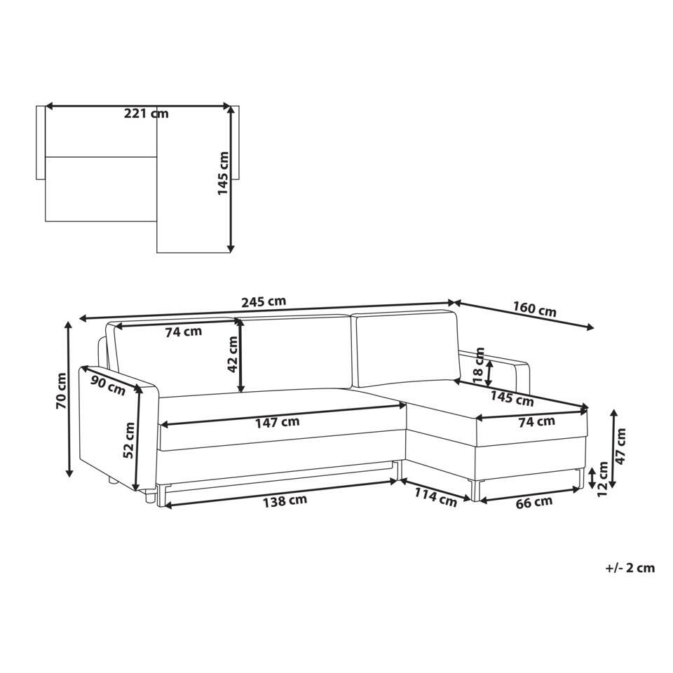 Comfortabele hoekbank met opbergruimte. Deze elegante en veelzijdige bank brengt stijl en functionaliteit in je woonruimte. Hij is bekleed met polyester stof van hoge kwaliteit, heeft een handige slaapfunctie voor gasten die blijven slapen en verborgen opbergruimte onder de chaise en zitting. Ideaal om het comfort te maximaliseren en tegelijkertijd ruimte te besparen, dit meubel is de perfecte mix van vorm en functie. Dankzij de rijke, diepe kleur past hij bij verschillende moderne interieurstijlen.