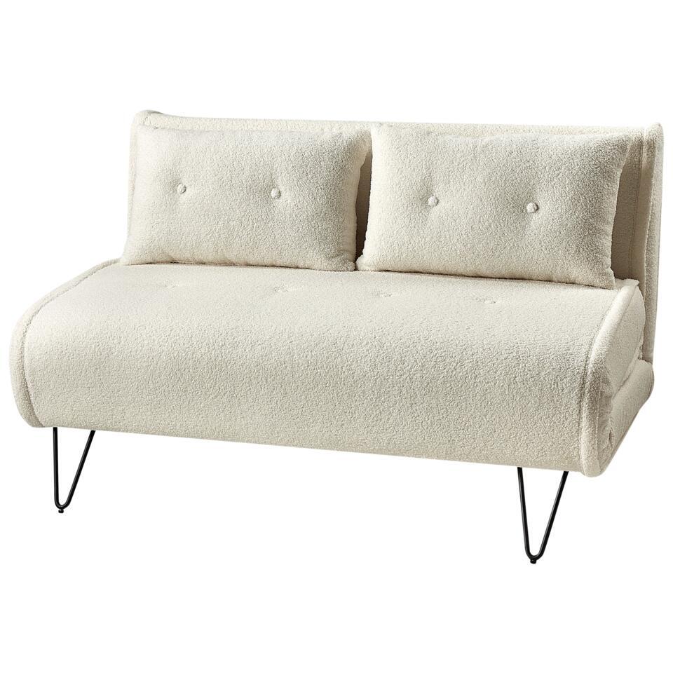 Tweezits slaapbank. Geef je interieur een glamoureuze uitstraling met deze functionele en verleidelijke slaapbank. De bekleding van duurzame boucléstof voelt uitzonderlijk zacht aan en de dikke vulling maakt het een echt comfortabel meubelstuk. De chique uitstraling van het meubel wordt benadrukt door de zwarte metalen poten. Het extra kussen met knoopjes en afneembare hoes voegt wat charme en gezelligheid toe aan de bank. Bovendien hoef je je dankzij de eenvoudig te bedienen slaapfunctie geen zorgen te maken als je gasten bij je willen blijven slapen.