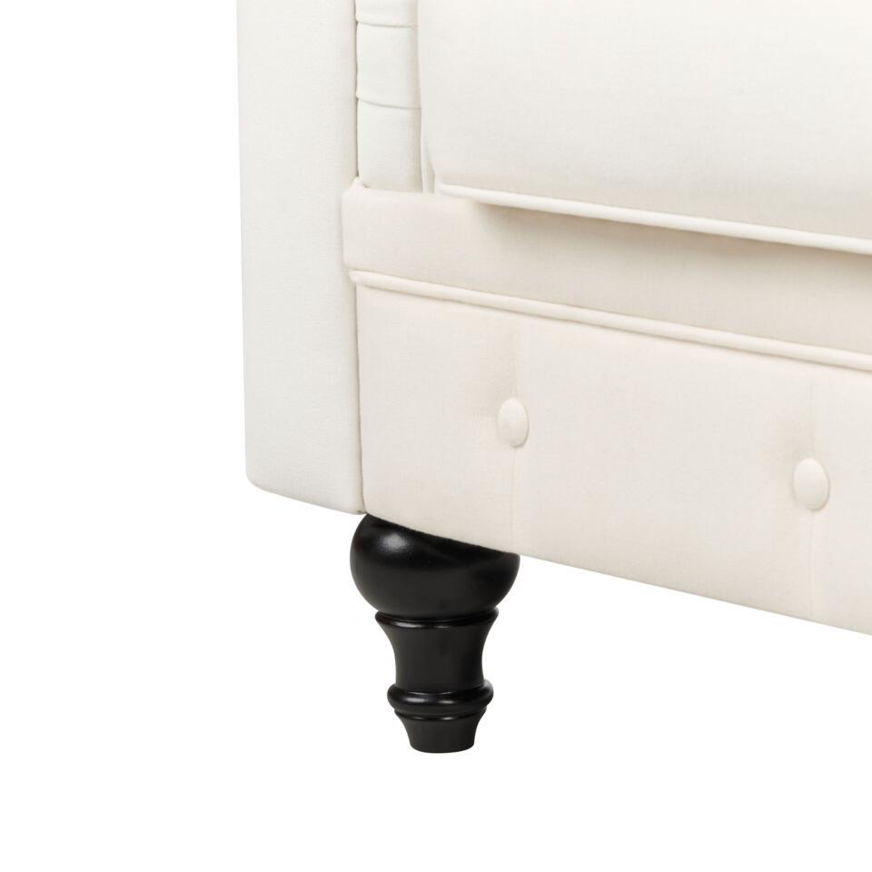 Klassieke zetel in lichte stof. Deze fauteuil, gekenmerkt door een gebogen silhouet met brede krularmen, wordt geleverd in een iconische Chesterfield-stijl die past in elk modern of traditioneel interieur. De lage rugleuning en de zachte, dik gevoerde zitkussens zorgen voor een uitstekend zitcomfort. De zitting is bekleed met een witte linnenachtige polyester stof en is voorzien van klassieke diamanten knopen. Deze Engelse klassieker is gemakkelijk te onderhouden en past in elk interieur.