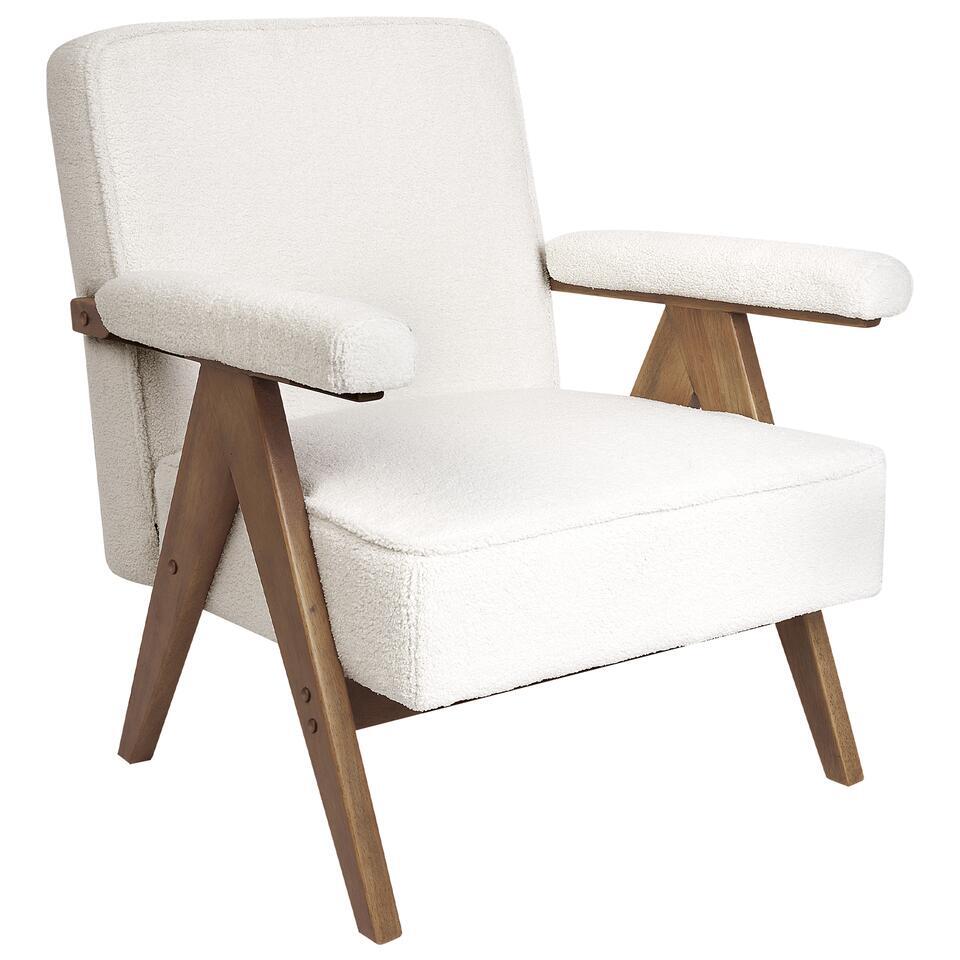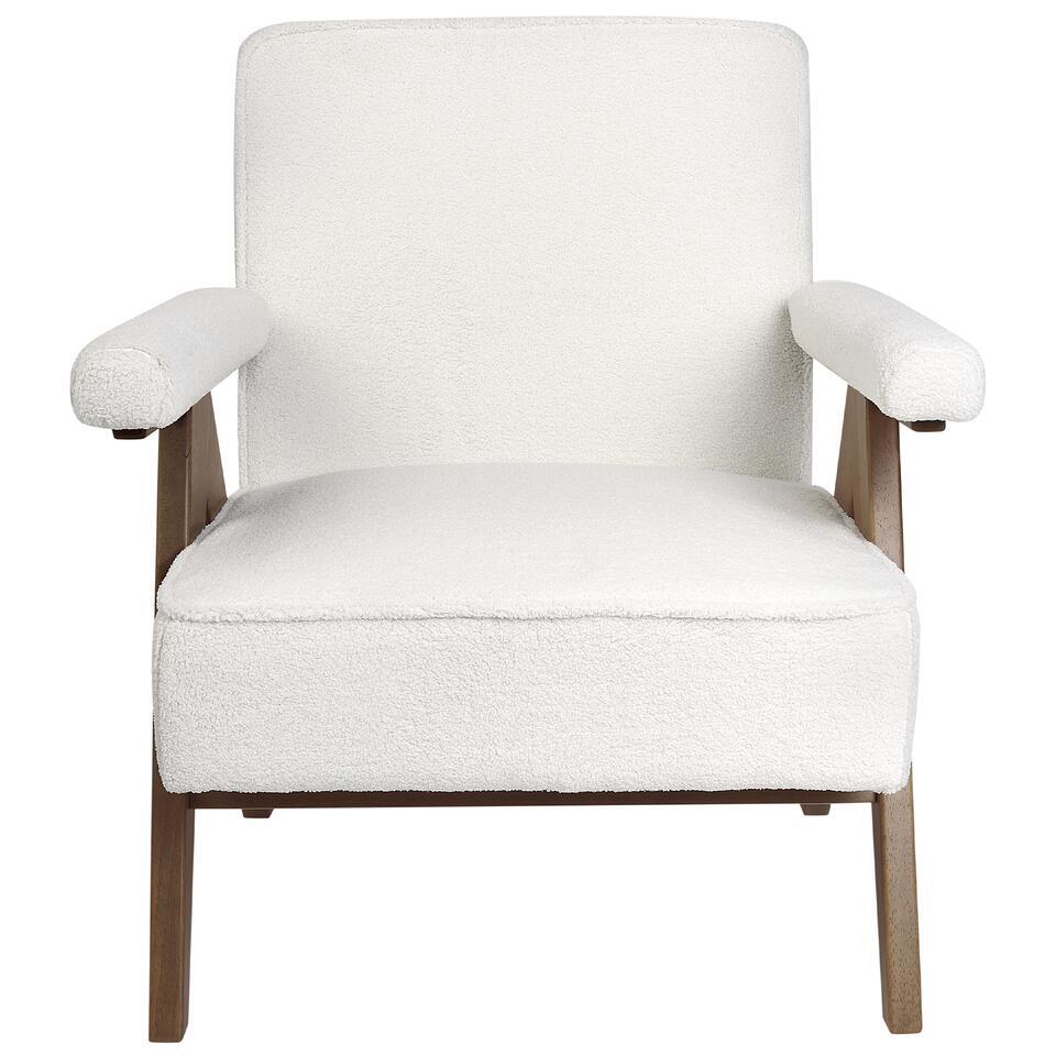 Gestoffeerde retro zetel. Geef je kamer een oppepper met deze fauteuil in retrostijl, met slanke houten poten en een dik gevoerde zitting bekleed met een duurzame bouclé stof die de zachte touch van linnen nabootst. De armleuningen zijn ontworpen voor ultiem comfort en hebben kussens, waardoor het de perfecte mix is van vintage charme en moderne gezelligheid. Deze fauteuil is ideaal om in te loungen en voegt een vleugje nostalgische elegantie toe aan elke kamer terwijl hij tegelijkertijd geweldige ondersteuning en ontspanning biedt.