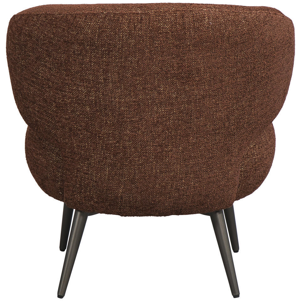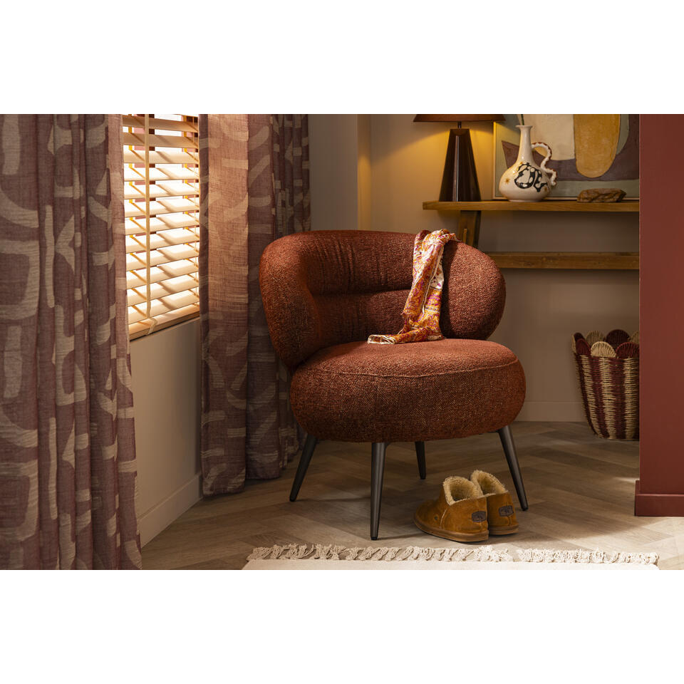 De ronde vormen en knusse uitstraling maken deze fauteuil tot een echte sfeermaker. De natuurlijke terra kleur voegt warmte toe aan je interieur en laat zich moeiteloos combineren met neutrale of aardse tinten.