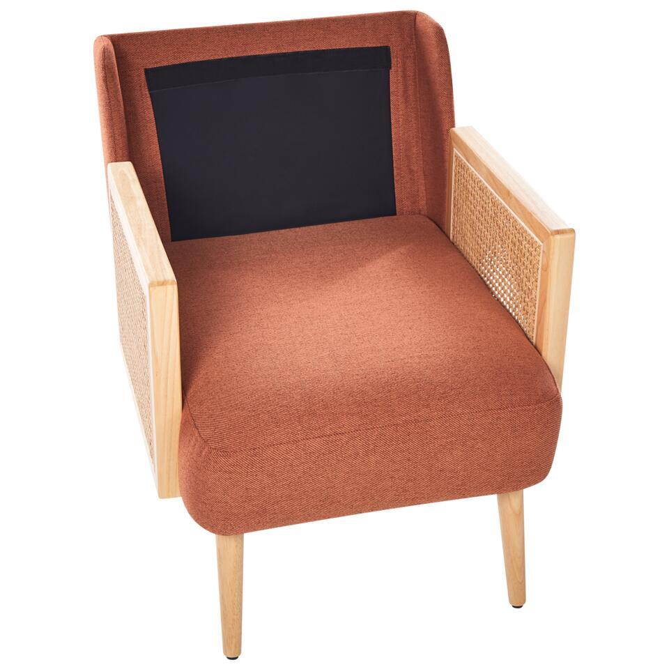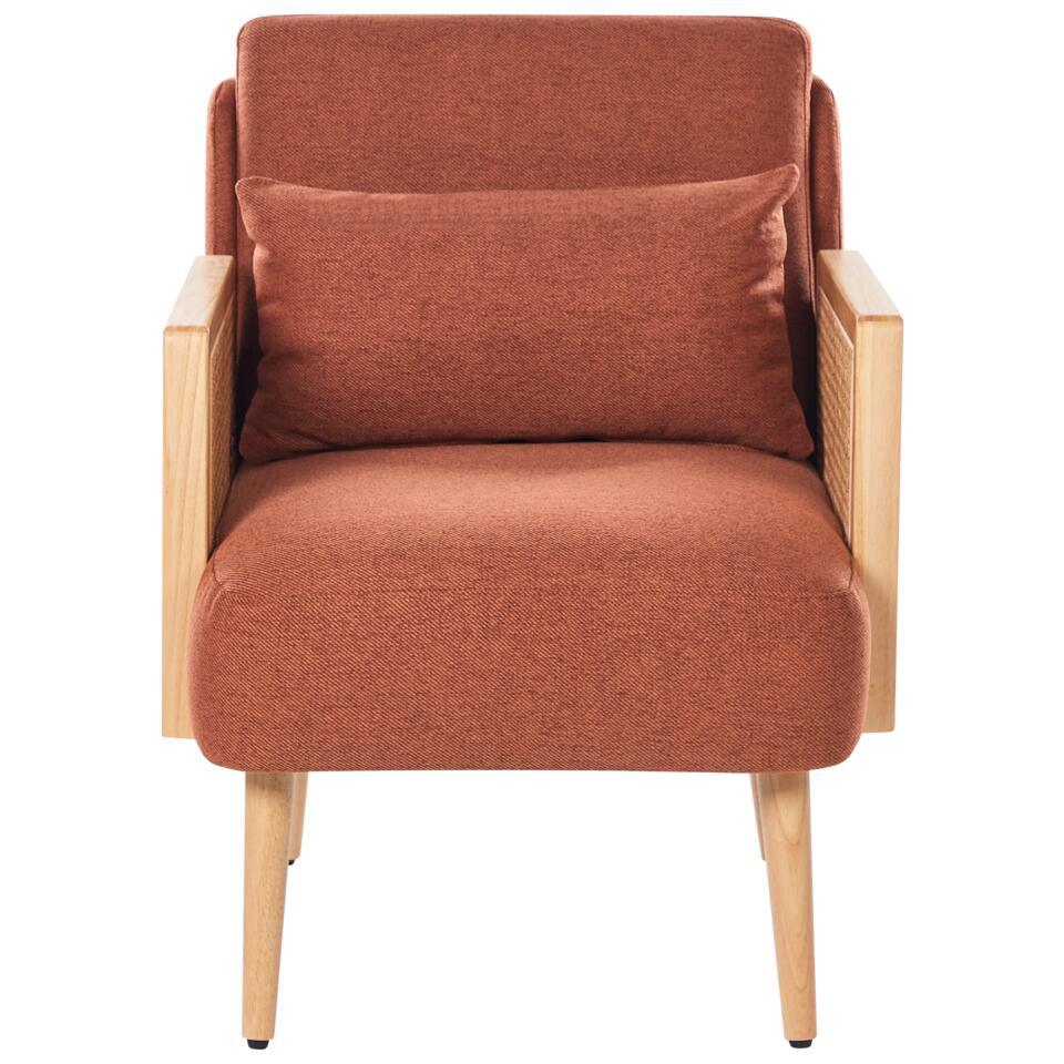 Fauteuil met rotan vlechtwerk. Ontdek de uitstraling van deze zorgvuldig gemaakte fauteuil, die elegantie uitstraalt en past bij elke smaak. Geniet van het pluche comfort van de polyester bekleding, met ondersteuning van een robuust houten frame en sierlijk toelopende poten. Het rotan siervlechtwerk op de armleuningen voegt charme en elegantie toe aan het geheel. De veelzijdige neutrale tint harmonieert moeiteloos met diverse interieurs. Om ervoor te zorgen dat je vloer geen schade oploopt, zijn de beschermende kunststof pootdoppen zorgvuldig geïntegreerd.