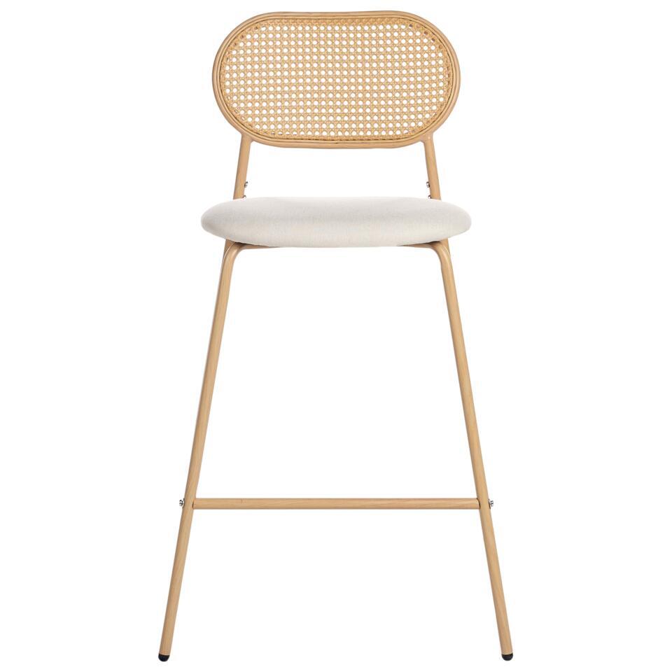 Set van 2 barstoelen met rotan rugleuning. In deze set van twee barkrukken komen stevigheid en stijl perfect samen. Geniet van de retrolook met het metalen frame en de afwerking met licht houteffect, die een nostalgische charme uitstralen. De met stof beklede zitting en rugleuning, versierd met Weens vlechtwerk, maken het zitcomfort tot een kunstvorm. Geef je ruimte een nieuwe uitstraling met een vleugje glamour van weleer en de functionaliteit van tegenwoordig.