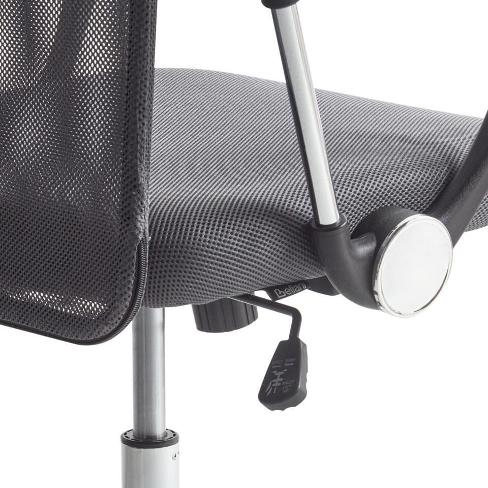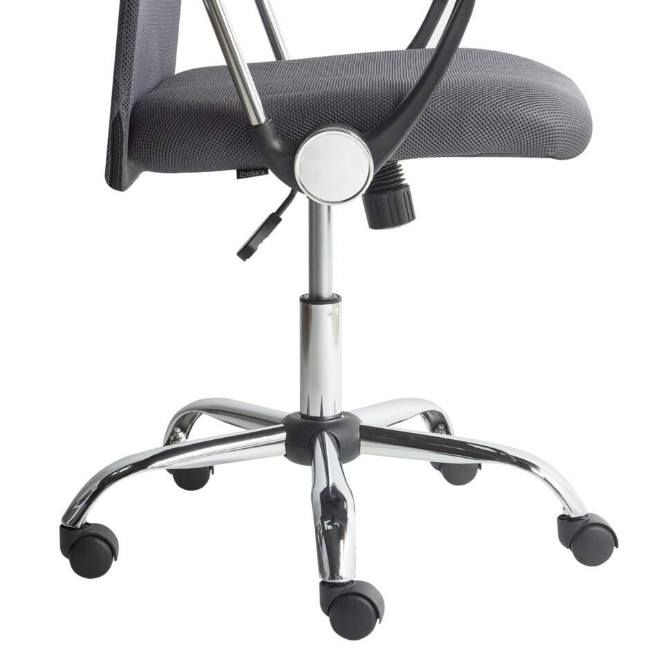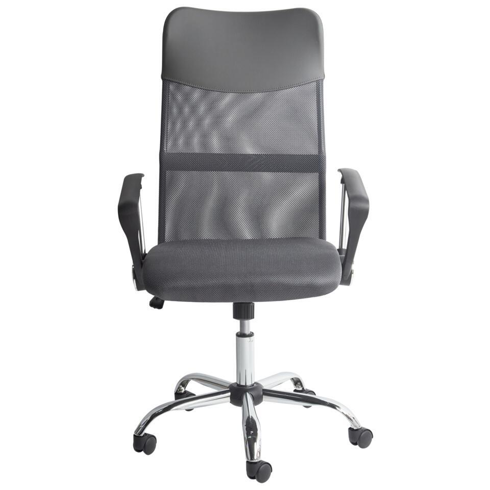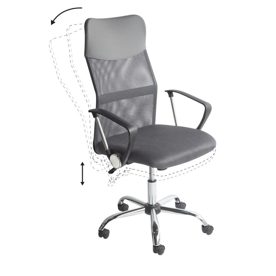 Executive bureaustoel met hoge rugleuning. Deze kantoorstoel met een ergonomisch ontwerp biedt ondersteuning voor je lichaam tijdens lange werkdagen. Met de verstelbare zithoogte, 360° draaibaarheid en het kantelmechanisme kun je de stoel aan passen aan jouw comfort. De metalen, verchroomde basis is voorzien van 5 soepel rollende wieltjes. De dik gevoerde zitting is bedekt met een doorlatende mesh-stof, met hoogwaardig kunstleer op de hoofdsteun.