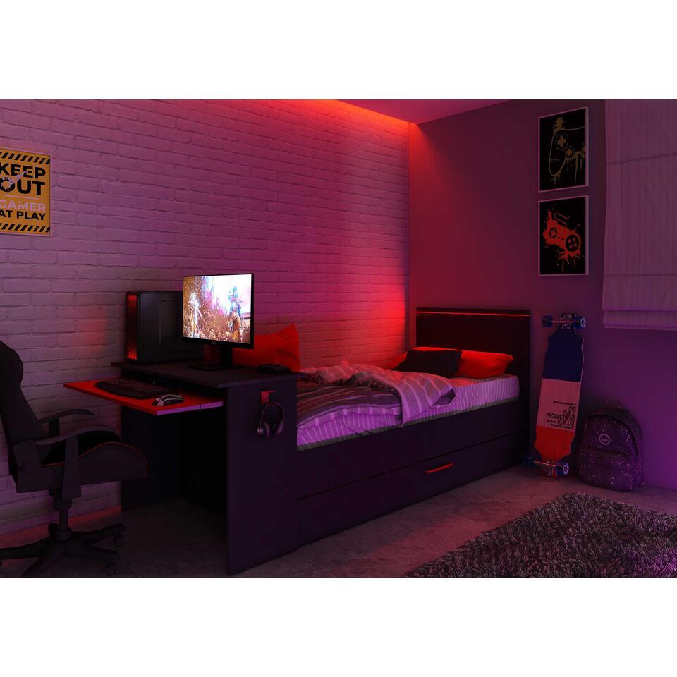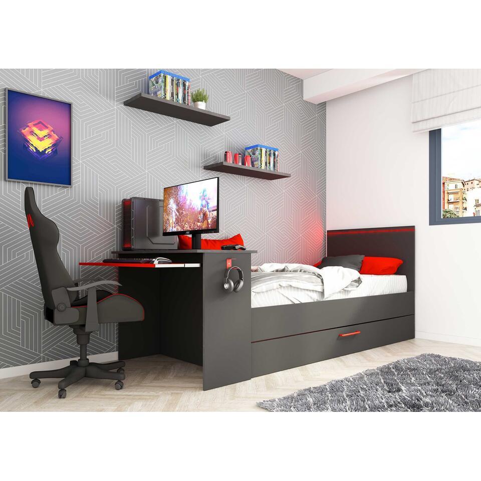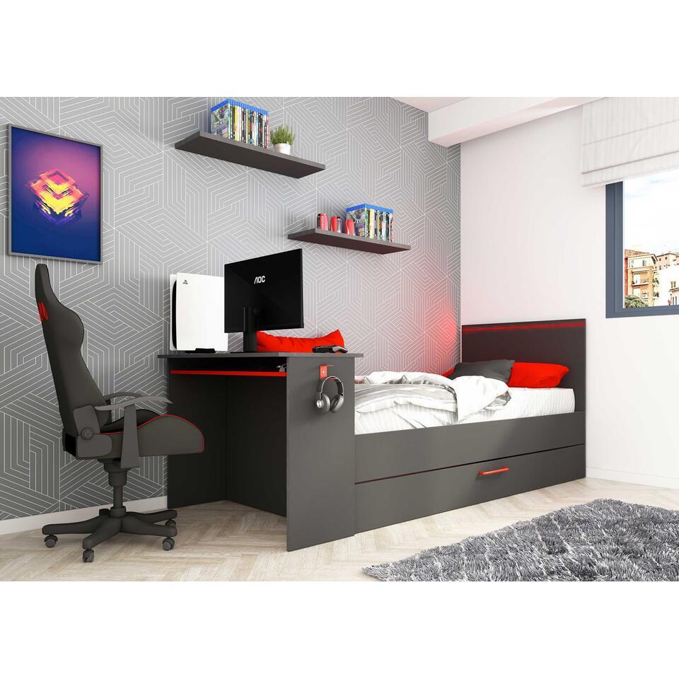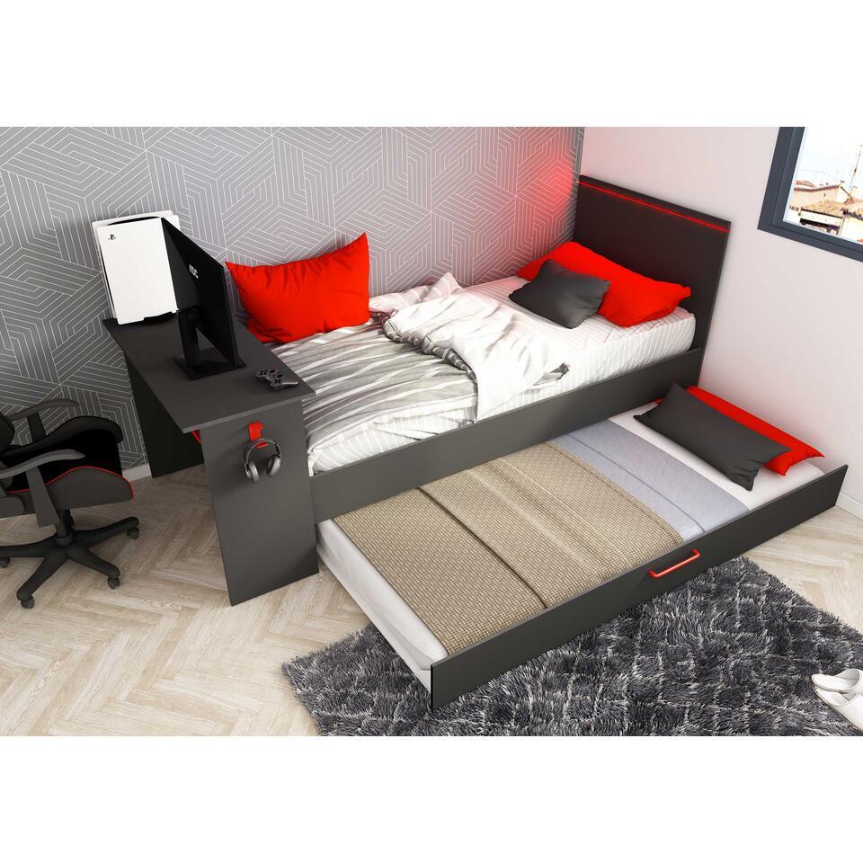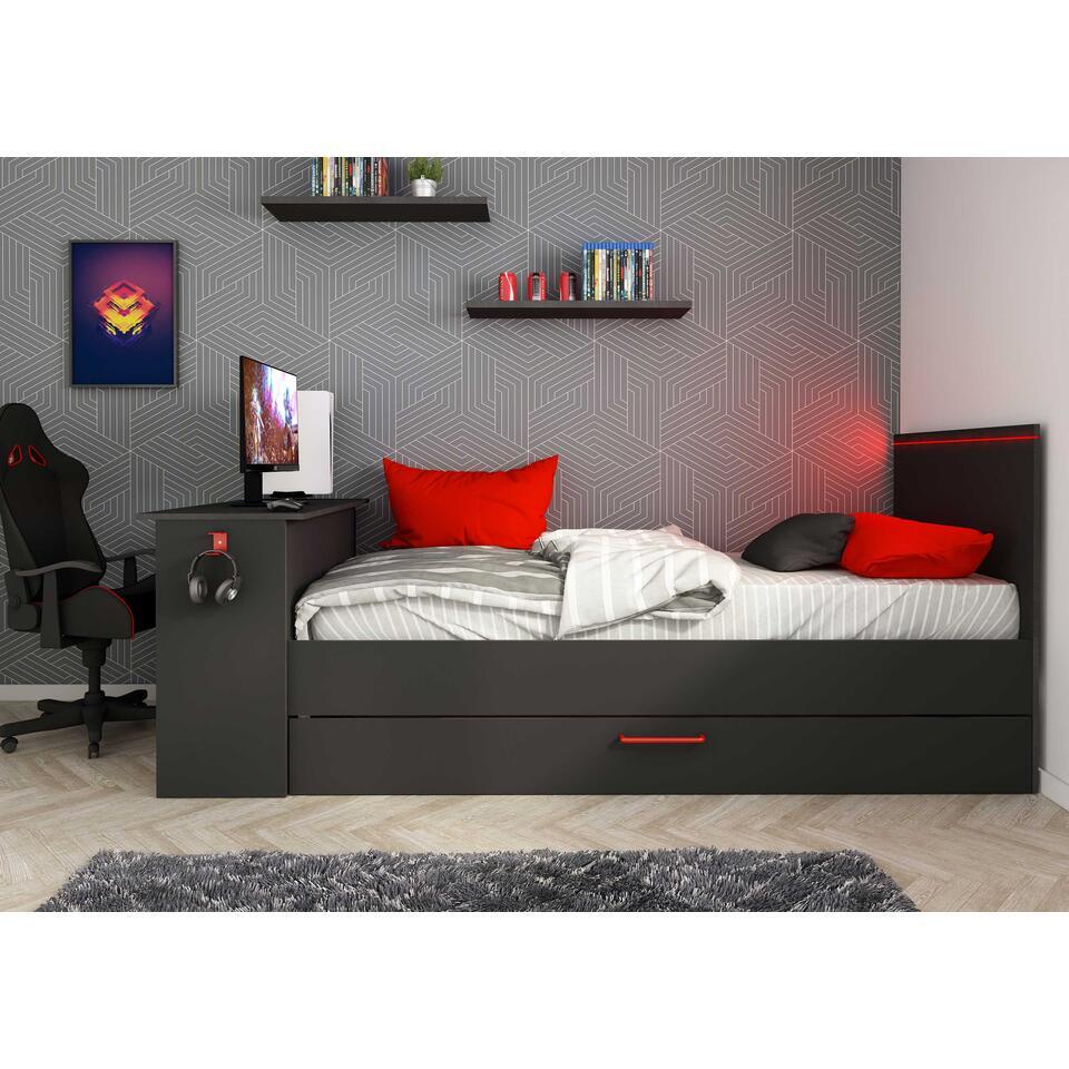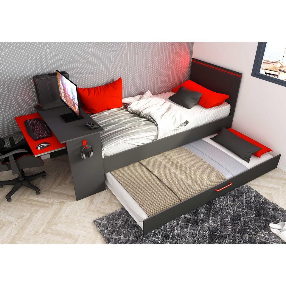 Het Bed Bzone is een musthave voor in elke stoere tienerkamer. Door de combinatie van antraciet en rood krijgt het geheel een luxe uitstraling. Bovendien is het bed van alle gemakken voorzien: een bureau (met een uitschuifbare toetsenbordlade), een bedlade op wieltjes, een haak om een koptelefoon aan op te hangen en ingebouwde ledverlichting. Dankzij de bedlade is er ruimte voor 2 matrassen van 90x200 cm, ideaal dus wanneer er onverwachts een vriend of vriendin komt logeren. Opgelet: de lattenbodem voor het bovenste slaapgedeelte en de 2 matrassen zijn niet inbegrepen. Deze kunnen apart aangekocht worden op onze site.