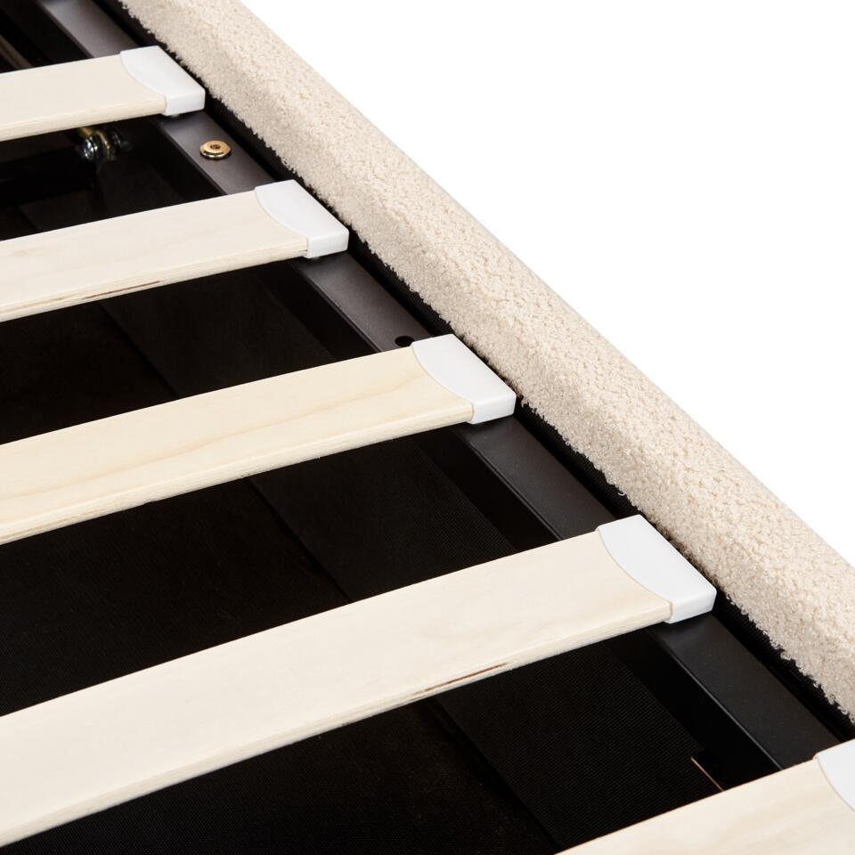 Klassiek opbergbed met zachte stoffering. Dit klassieke bed zal niet alleen je nachten veel beter en ontspannender maken, maar ook charme aan je slaapkamer toevoegen. Het bed is gemaakt van duurzame boucléstof in beige, waardoor het stuk kan worden gecombineerd met verschillende accessoires en kleurrijke lakens. Bovendien heeft het geen dagelijks onderhoud nodig om vele jaren mee te gaan, waardoor het een uitstekende keuze is voor degenen die duurzaamheid waarderen. Onder de lattenbodem heeft het bed een opbergvak, waar je extra dekbedden of kussens kunt opbergen.