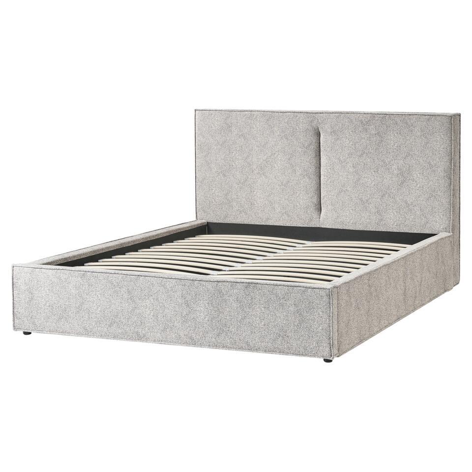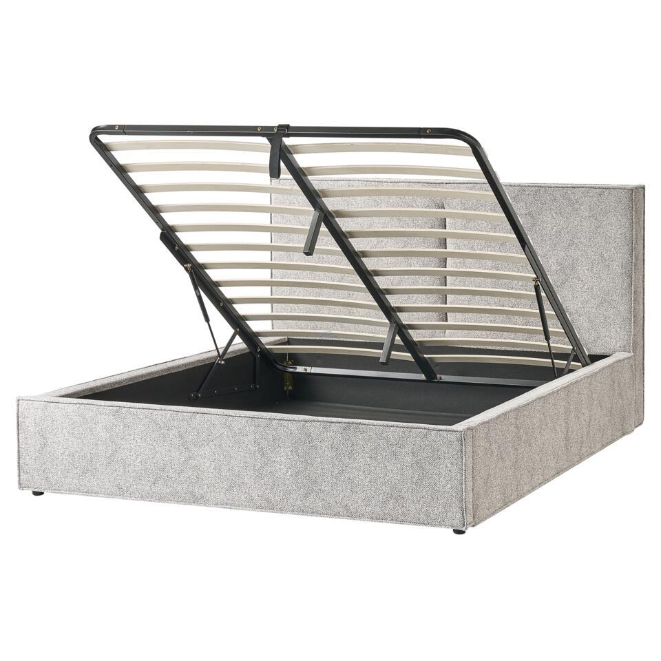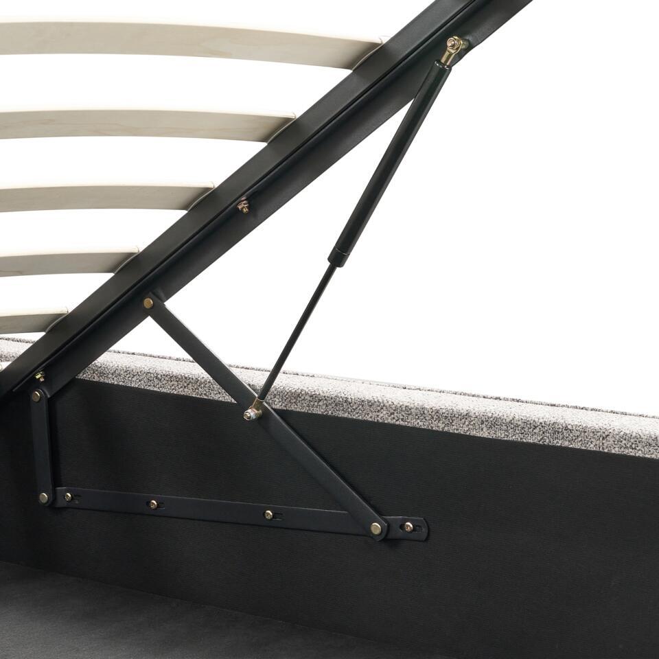 Minimalistisch bed met opbergruimte. Als je op zoek bent naar een bed dat eenvoud, elegantie en comfort combineert, kijk dan niet verder dan dit mooie minimalistische stuk. Dit bed, dat perfect past in moderne en Scandinavische interieurs, heeft een gestroomlijnd silhouet en is bekleed met gebreide veloursstof van hoge kwaliteit. Het gestippelde patroon en de in elkaar overlopende draden van het breisel voegen een subtiele textuur en visuele interesse toe en creëren een zacht, uitnodigend oppervlak dat zowel duurzaam als luxueus aanvoelt. Het bed heeft een opklapbare lattenbodem voor optimaal comfort en ondersteuning, samen met ingebouwde opbergruimte om je beddengoed en andere benodigdheden netjes op te bergen. Dit bed is meer dan alleen een plek om uit te rusten, het is een geraffineerd statement dat zowel de stijl als de gezelligheid van je ruimte verbetert.