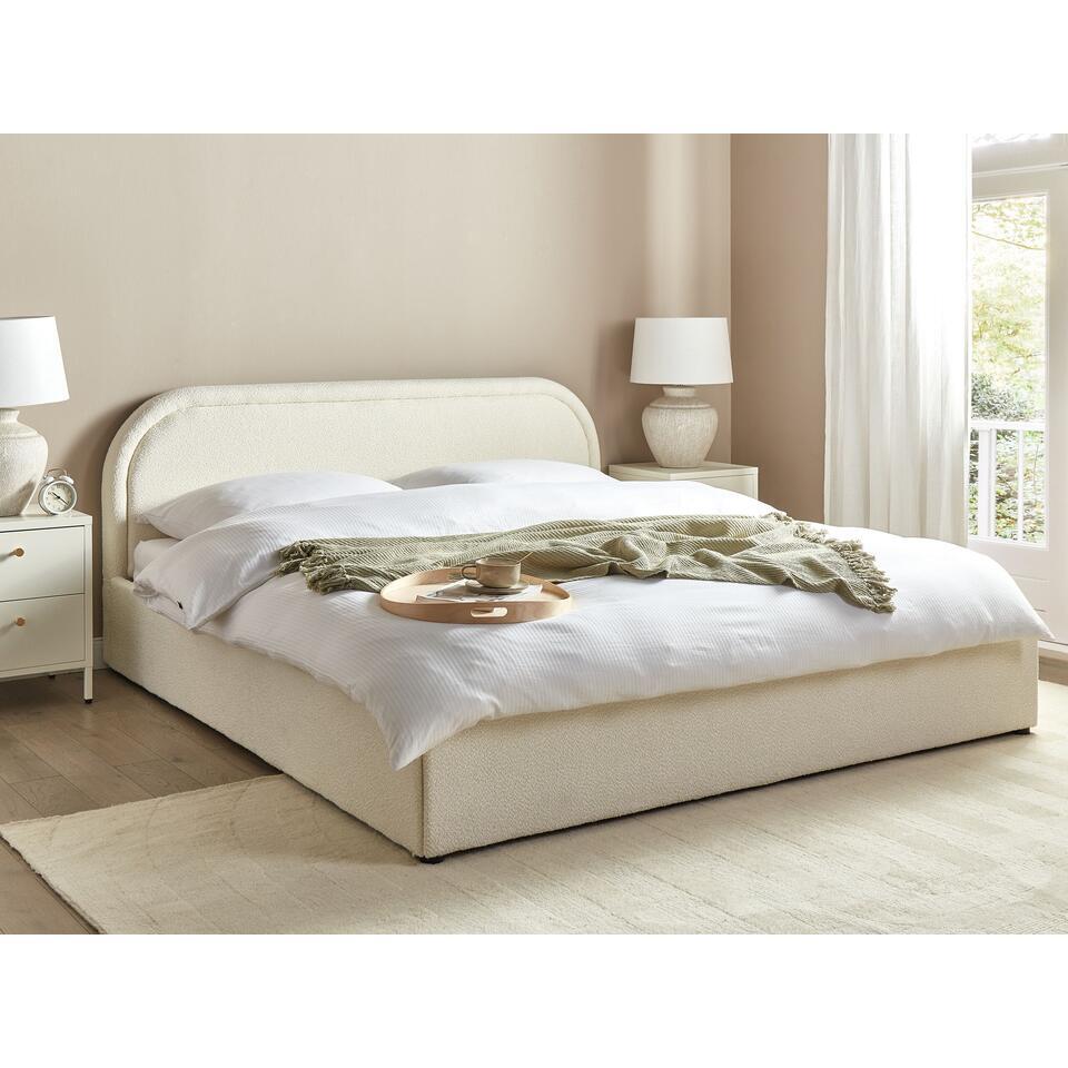 Bed met hoofdbord in moderne stijl. Dit bed heeft een stijlvol en functioneel ontwerp, wat perfect is voor moderne slaapkamers. Het heeft een comfortabel hoofdbord bekleed met zachte bouclé stof, die een vleugje luxe en textuur toevoegt. Het frame heeft ingebouwde opbergvakken, ideaal om de ruimte te optimaliseren door beddengoed of andere spullen netjes op te bergen. De stevige lattenbodem zorgt voor een duurzame ondersteuning en luchtstroom, waardoor het matras langer meegaat en comfortabeler ligt. De combinatie van praktisch nut en chique design maakt het een geweldige aanwinst voor elk modern huis.