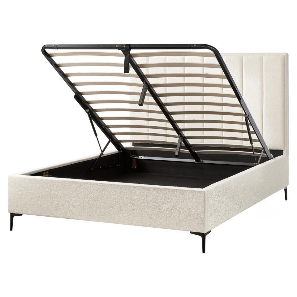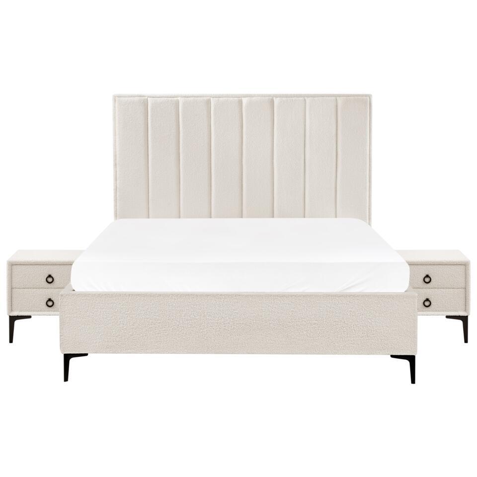 Bed met opbergruimte en twee handige nachtkastjes. Deze prachtige set slaapkamermeubels bestaande uit een bed en twee nachtkastjes is een perfecte manier om elke master suite mooier te maken. De klassieke vormen en prachtige bekleding maken het een waar pronkstuk in vrijwel elke omgeving. Het bed heeft een robuust en duurzaam frame, volledig bekleed met hoogwaardige en zacht aanvoelende bouclé stof. Het biedt een ruime, omhoog te klappen opbergruimte die je zal helpen je slaapkamer efficiënt te organiseren. De set wordt geleverd met twee bijpassende nachtkastjes, zodat je alle benodigdheden bij de hand kunt houden.