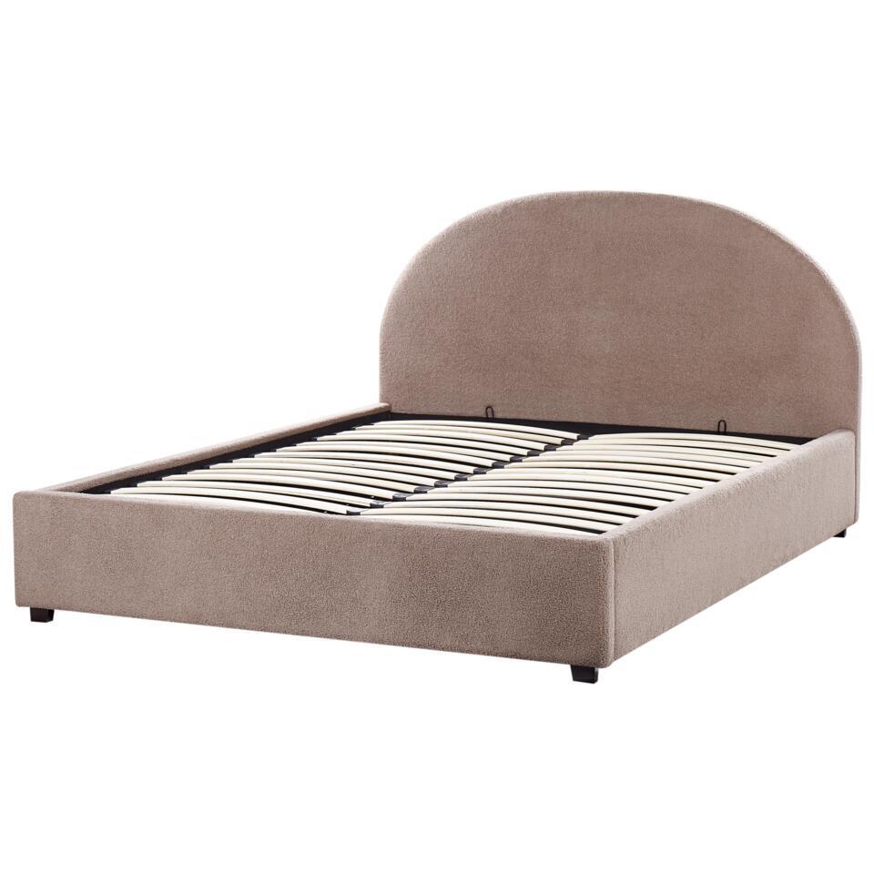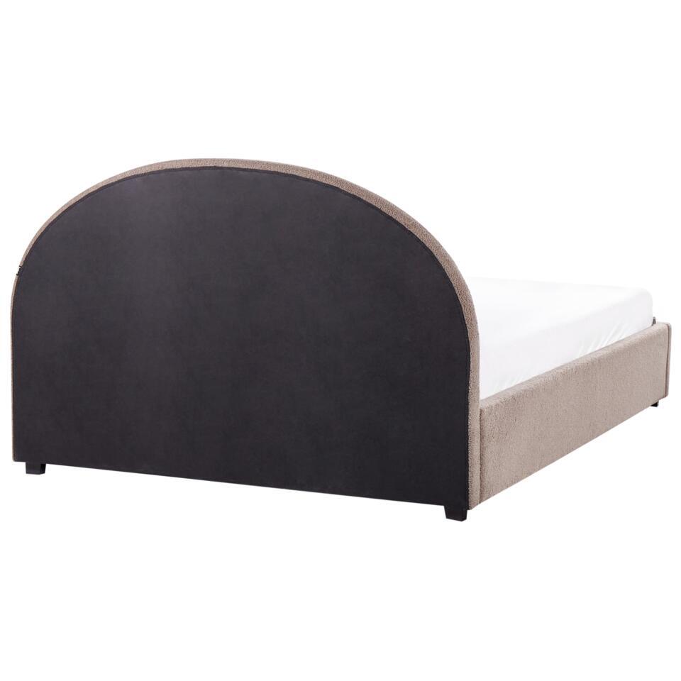 Minimalistisch bed met halfrond hoofdbord. De ronde vormen en zachte stoffen zijn perfect voor een retro inrichting van je slaapkamer. Geen enkel ander bed past beter bij deze interieurstijl dan dit bouclé bed in taupe kleur. De bekleding is niet alleen lekker zacht, maar ook onderhoudsvriendelijk en duurzaam, waardoor het bed jarenlang meegaat. Met zijn ronde hoofdeinde geeft het een uitnodigende uitstraling aan een slaapkamer. Het bed wordt geleverd met opbergruimte zodat je je extra kussens en beddengoed binnen handbereik hebt.