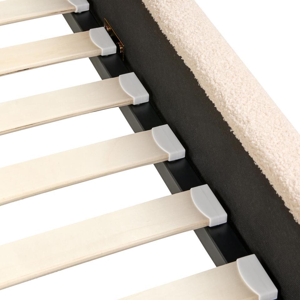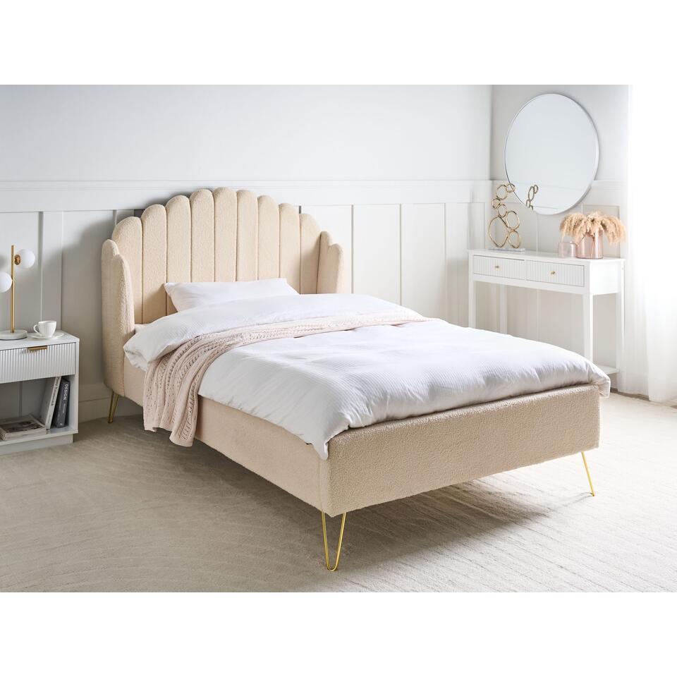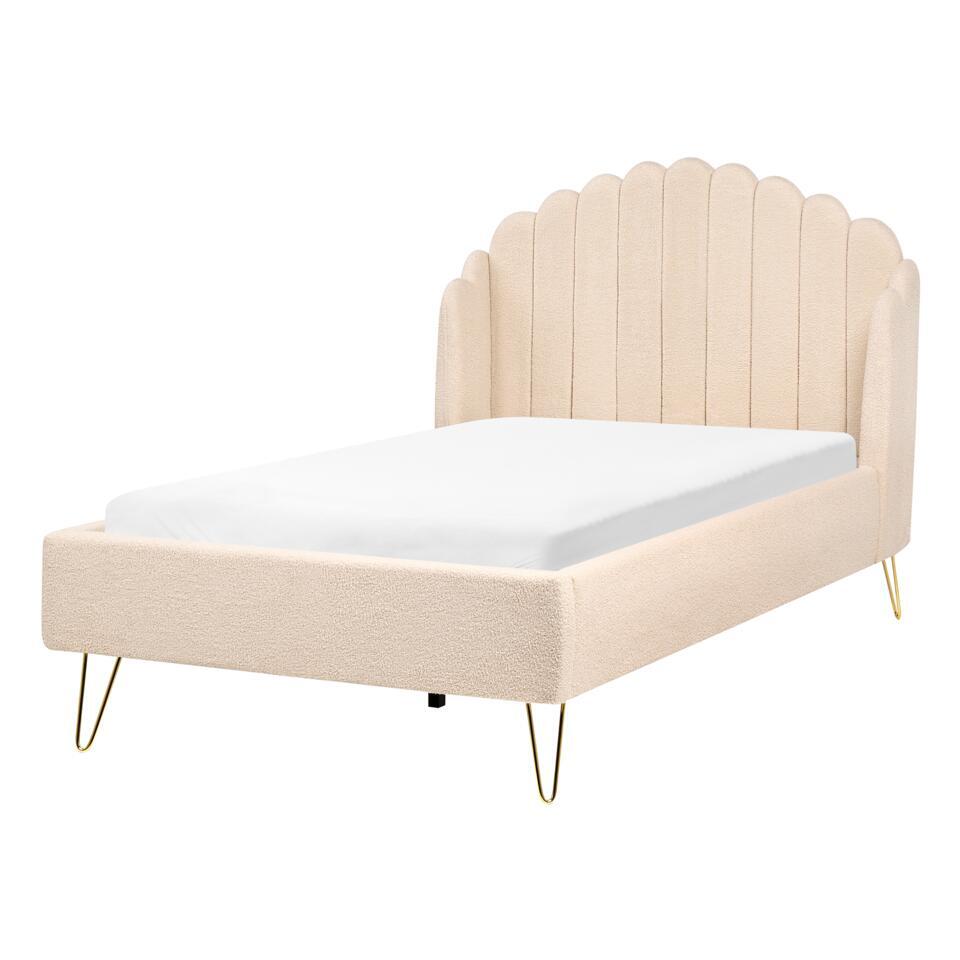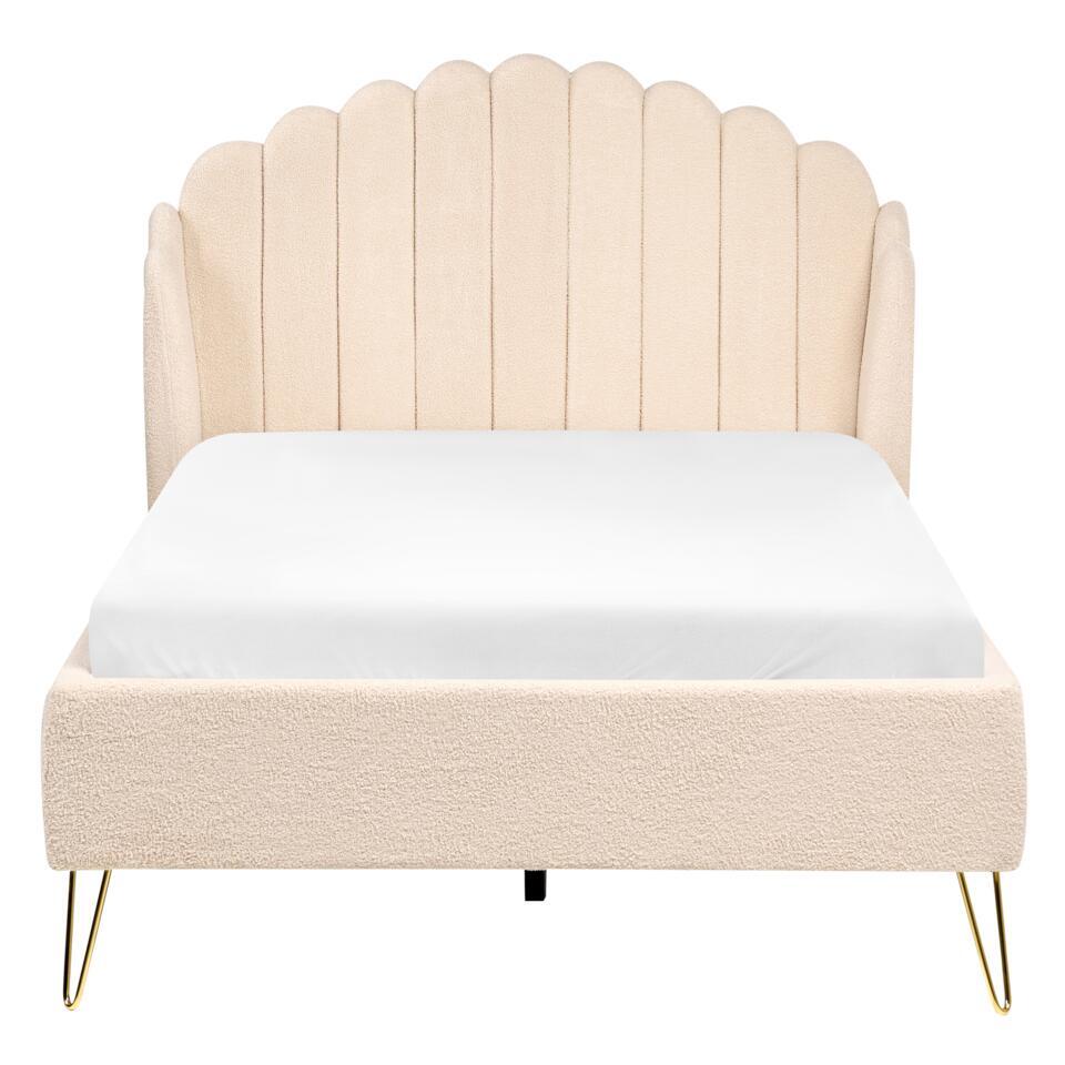 Bedframe met schelpvorm hoofdbord. Maak kennis met het bed van je dromen. Deze bouclé gestoffeerde schoonheid in retro-look wordt het pronkstuk van elke slaapkamer. Met zijn gouden haarspeldpoten en gecapitonneerd hoofdeinde geeft hij je interieur een glamoureuze uitstraling. Het hoofdeinde heeft gevleugelde uiteinden, waardoor er een gezellige ruimte ontstaat om je favoriete series te kijken of 's avonds een boek te lezen. De set bevat ook een lattenbodem die zorgt voor een stabiele ondersteuning van de matras.
