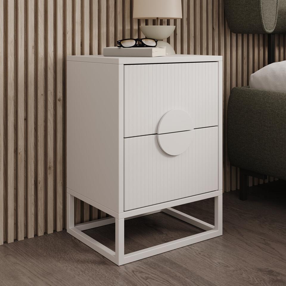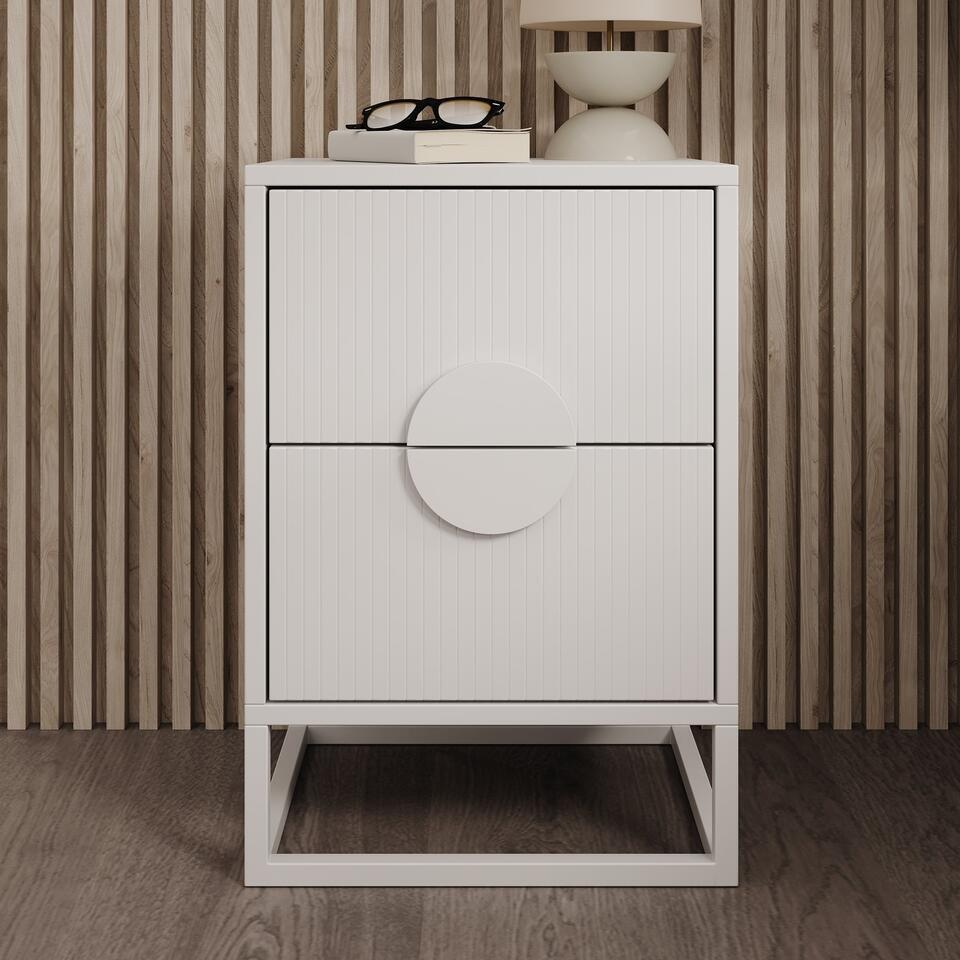 Nachtkastje Allegany is gemaakt in witte kleur. De kast beschikt over 2 lades die openen met maanvormige handgrepen. De voorkant van de lades hebben een latten patroon. De Allegany staat op metalen poten. Het meubel wordt ongemonteerd geleverd. Je dient het dus met behulp van de bijgeleverde handleiding zelf in elkaar te zetten.