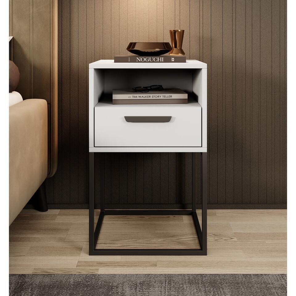 Nachtkastje Sylvester is uitgevoerd in een witte kleur met een zwart onderstel. Dit onderstel is gemaakt van metaal. Het meubel beschikt over 1 lade en 1 open vak. De lade opent met een zwarte handgreep. Het meubel wordt ongemonteerd geleverd. Je dient het dus met behulp van de bijgeleverde handleiding zelf in elkaar te zetten.