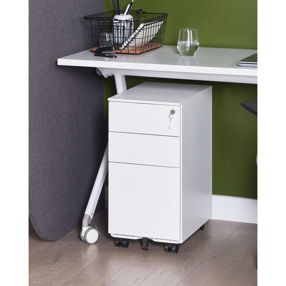 Witte metalen archiefkast. Deze mobiele, metalen archiefkast bestaat uit 2 kleine en 1 grote lade en biedt zo voldoende opbergruimte voor al je documenten en andere items. Met zijn industriële en tijdloze design is deze archiefkast een onmisbaar onderdeel van je studeerkamer of kantoorruimte.