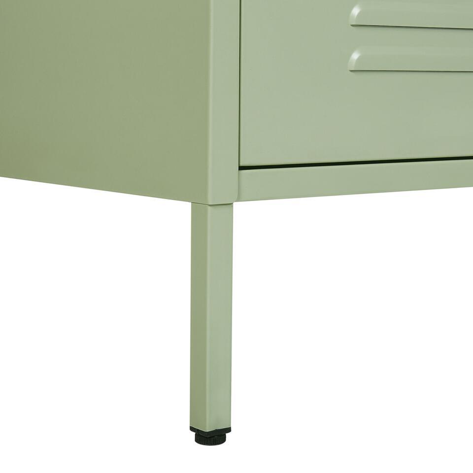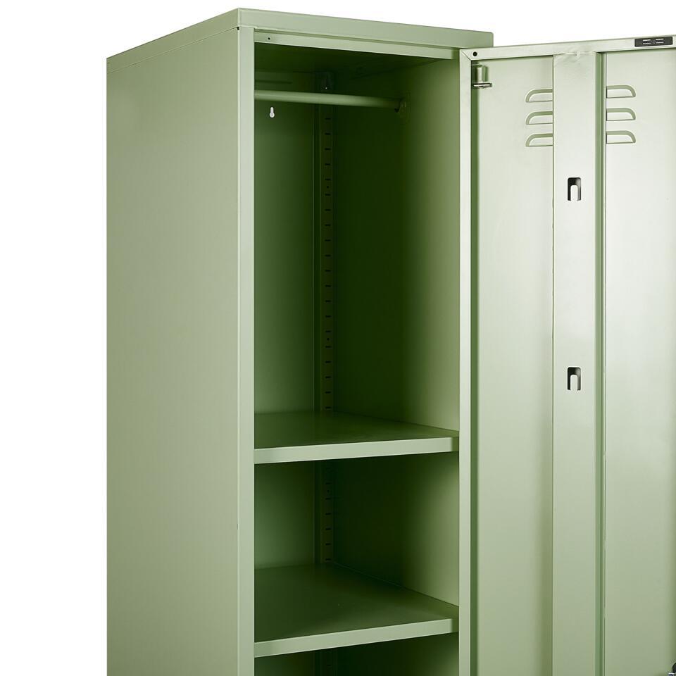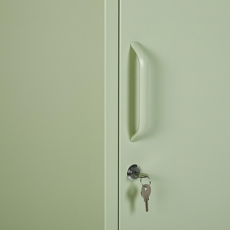 Praktische afsluitbare kledingkast van metaal met 5 vakken in lichtgroen. Een solide kast van staal is een functionele toevoeging aan elke kamer, garage of thuiskantoor. Deuren met sleutelvergrendeling garanderen privacy en veilige opslag van belangrijke items of documenten. De kast heeft vijf planken die kunnen worden verwijderd als je iets groters wilt opbergen of kleding aan een rail wilt hangen. Ventilatieopeningen zorgen voor een constante luchtstroom en voorkomen dat nare geurtjes zich binnenin ophopen.