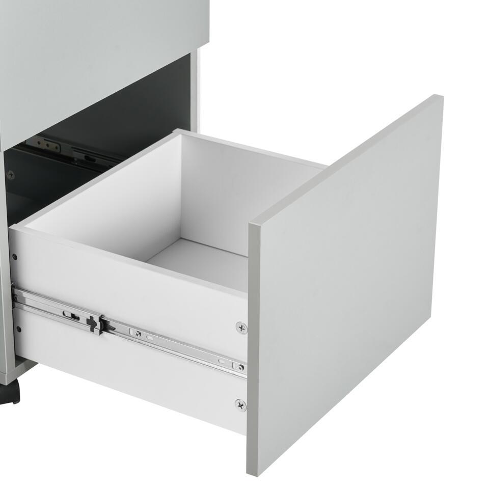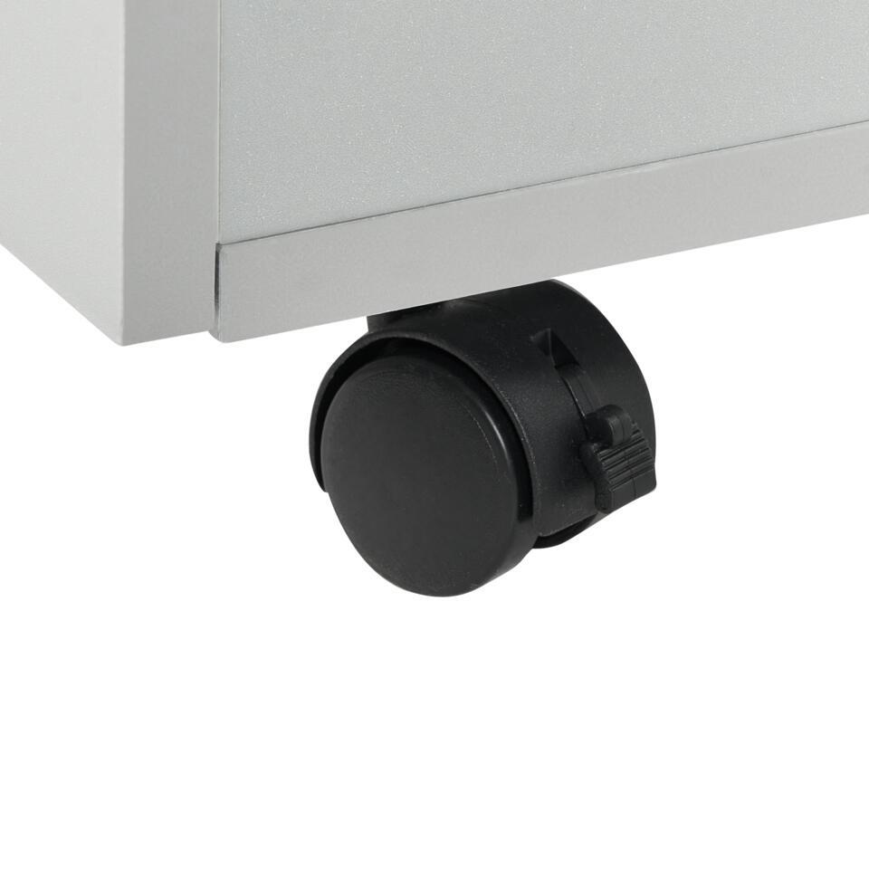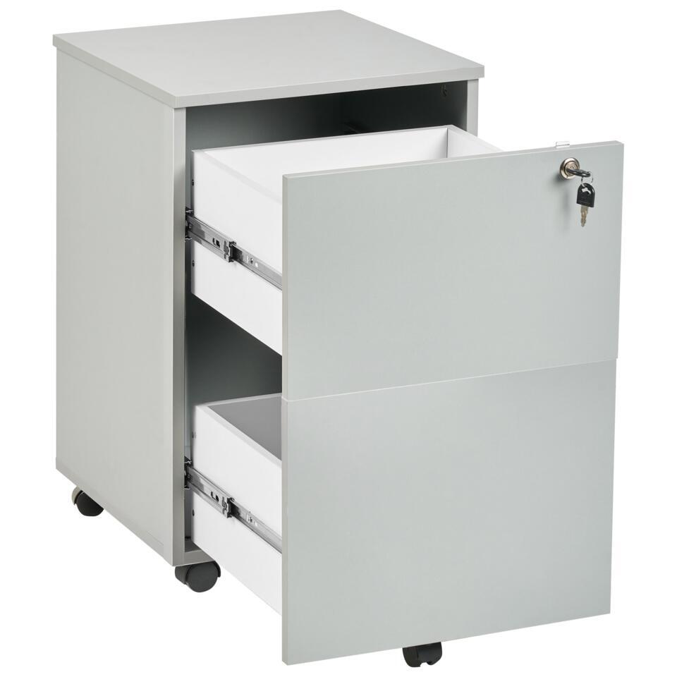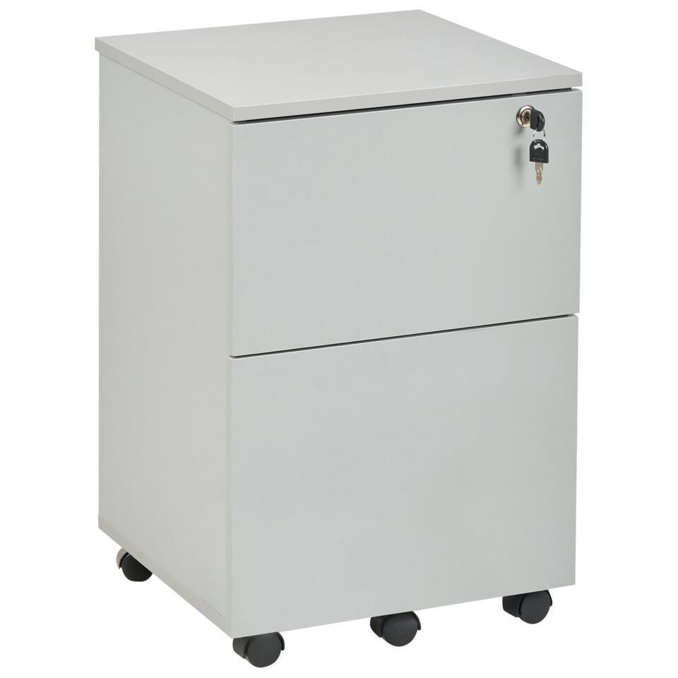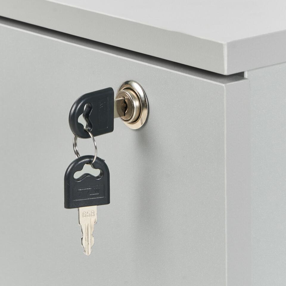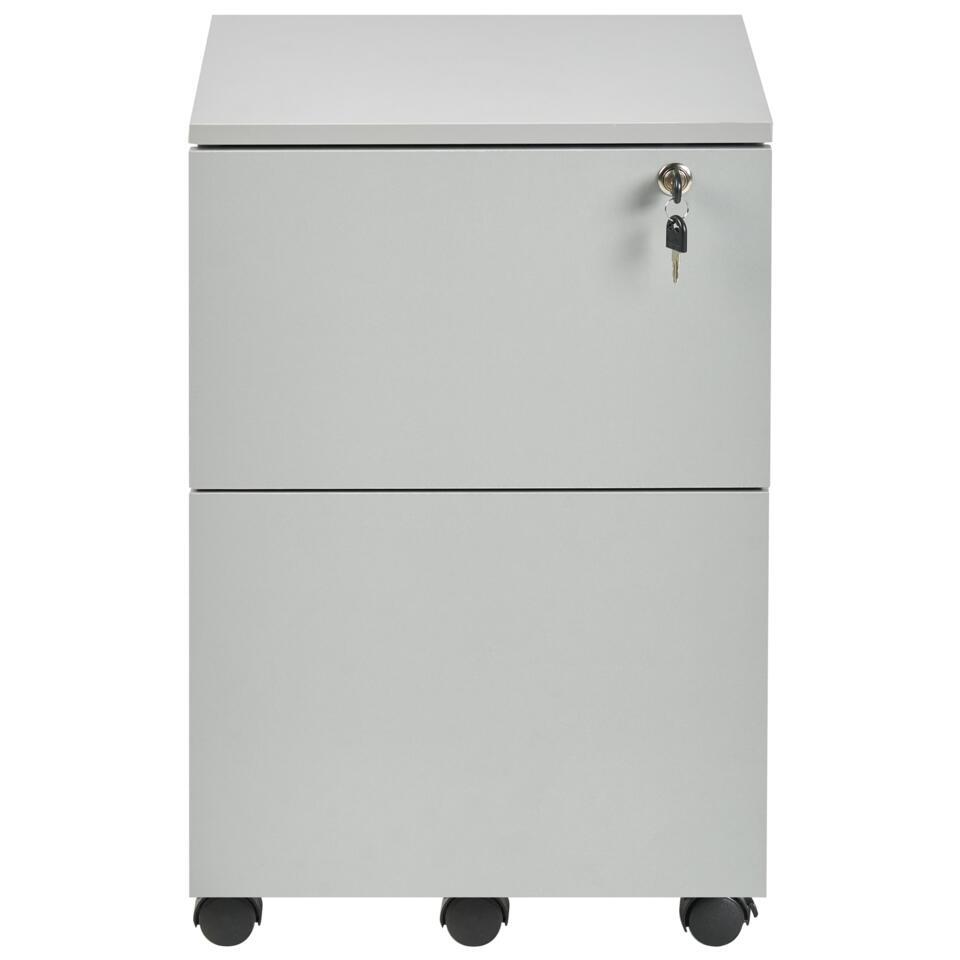 Opbergkast met slot. Geniet van functionele elegantie met deze praktische kantoorkast. Dit meubel in lichtgrijs brengt Scandinavische elegantie naar je werkplek. De twee lades met sleutelvergrendeling zorgen voor veiligheid voor je benodigdheden, terwijl de toevoeging van wielen de vrijheid geeft om je omgeving gemakkelijk te herschikken. Kies voor een perfecte combinatie van stijl en gemak met deze mobiele basis voor productiviteit in je kantoorruimte.