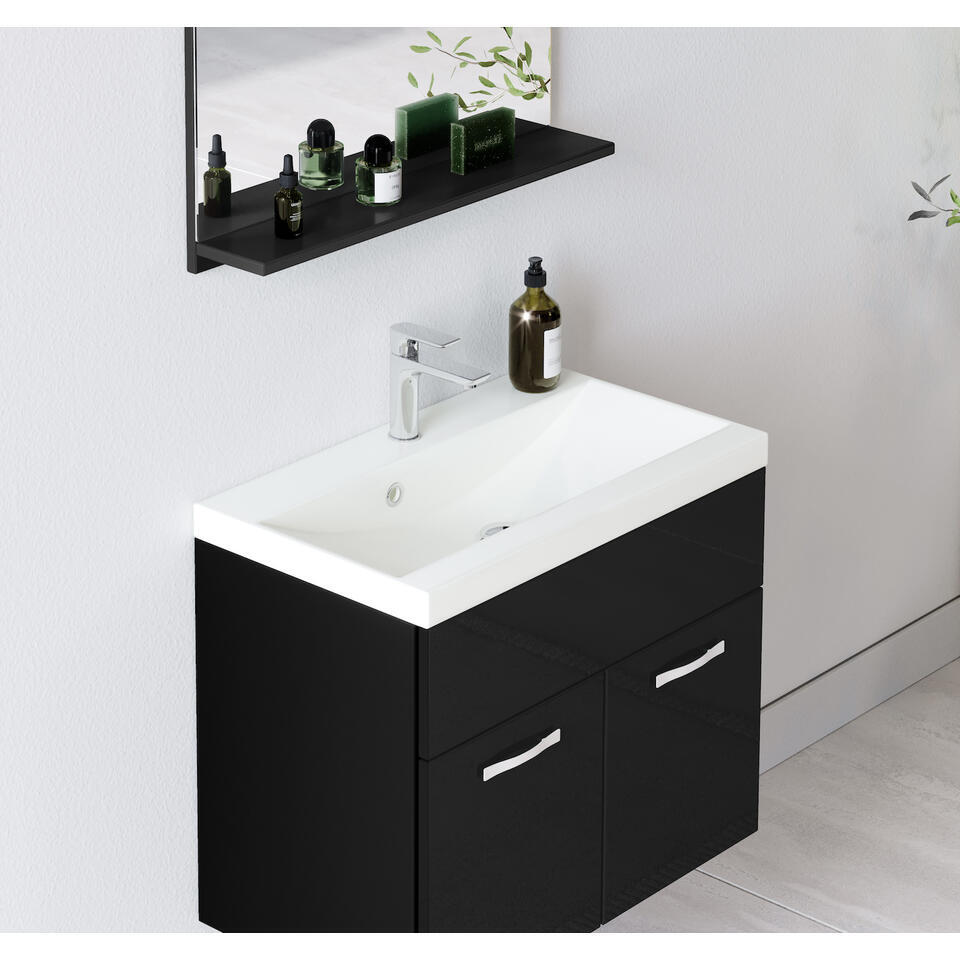 Badkamermeubel set Montreal inclusief wastafel.Deze set geeft iedere badkamer, groot of klein, extra bergruimte en een moderne en luxe uitstraling. Vanwege zijn strakke afwerking is het meubel gemakkelijk schoon te maken.De set is uitgevoerd in zwart met hoogglans fronten en is gemakkelijk te monteren. De kast is gemaakt van spaanplaat en de wastafel van kunstmarmer.