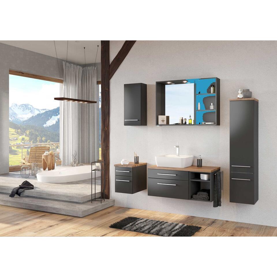 De meubelset Dasa in grijs zorgt voor een leuke, trendy sfeer in je badkamer. De combinatie van de gemelamineerde spaanplaat in grafietgrijs en de afwerking van de voorkant in donkergrijze, matte MDF schept een erg solide, aangenaam geheel. De wastafelonderkast is uitgerust met twee lades van verschillende grootte. Daarnaast is een geïntegreerd kastje met legplank, waardoor je toiletgerief gemakkelijk kunt opbergen. De handgrepen zijn gemaakt uit aluminiumgrijze kunststof. Ontdek ook de rest van de witte, mat grijze en wotaneiken Dasa-collectie bij Emob!