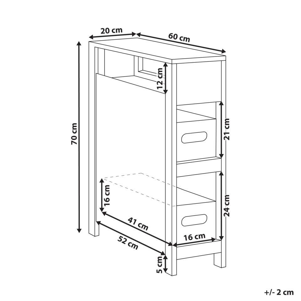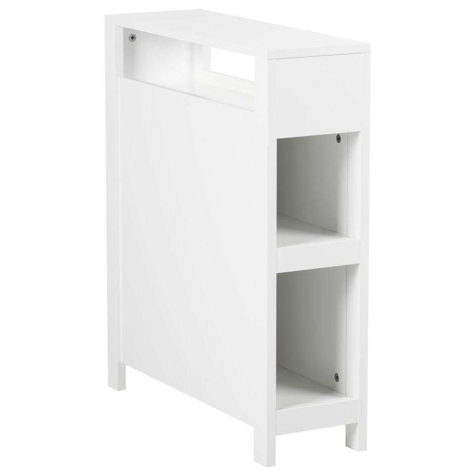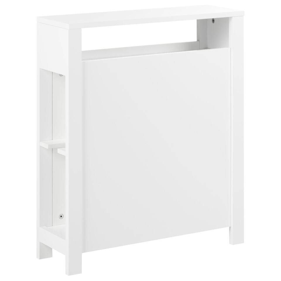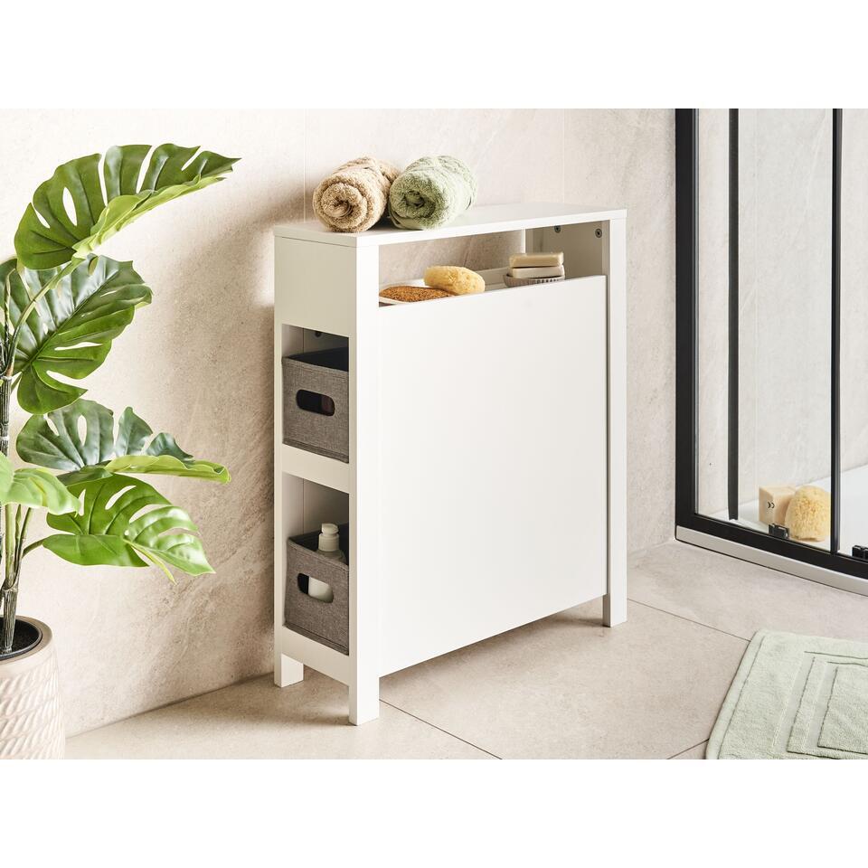 Smalle badkamerkast met mandjes. Dit smalle kastje is een perfecte oplossing voor elke badkamer met beperkte ruimte. Hij is gemaakt van lichtgewicht, duurzaam MDF en is gemakkelijk te verplaatsen en naar wens in te delen. Bovendien heeft het twee mandjes om kleine badkamerbenodigdheden in op te bergen. De neutrale witte kleur van de kast past bij verschillende stijlen en inrichtingen.