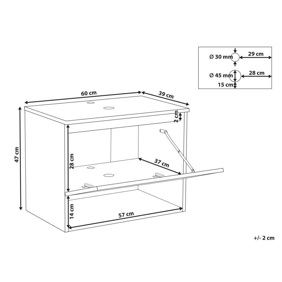 Badkamer wastafel kast. Dit badkamermeubel is klaar voor je wastafel, met voorgestanste gaten om de installatie eenvoudig en probleemloos te maken. Het kastje is ontworpen met twee planken en biedt een praktische manier om je toiletspullen te organiseren zonder afbreuk te doen aan stijl. De lichte houttint en melamine afwerking geven het een strakke, moderne look die in elk interieur past. Het is een eenvoudig, functioneel meubelstuk dat mooi in het interieur past en je ruimte netjes houdt.