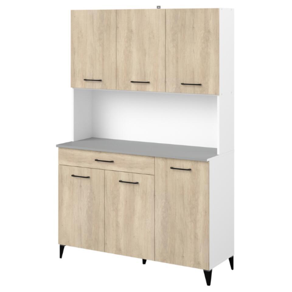 Heb je nood aan meer opbergruimte in de keuken? Ontdek dan zeker de mogelijkheden die de collectie Maleficent te bieden heeft. De moderne meubels zijn gemaakt uit spaanplaat en zijn afgewerkt met melamine in eikdecor. Deze buffetkast biedt met zijn lengte van 120cm een zee van opbergruimte. Achter de zes deuren zijn in totaal vier legplanken voorzien waardoor je al je keukenspullen netjes kunt opbergen. De lade biedt opbergruimte voor allerlei kleinere spullen en bestek. In het open vak kun je jouw kleine keukenapparaten, zoals de microgolf en koffiezetapparaat plaatsen, en maak je in de keuken meer werkruimte vrij. Bekijk de volledige collectie op onze website.