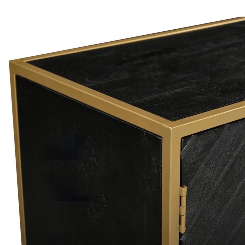 Het mangohout is massief en is eerst gezandstraald, waarna het behandeld wordt met zwarte verfbeits en tenslotte wordt afgewerkt met een donkere, natuurlijke bijenwas om het hout te beschermen tegen vocht, vuiligheid en kringen. Het frame en de handgrepen zijn gemaakt van goudkleurig gepoedercoat metaal.