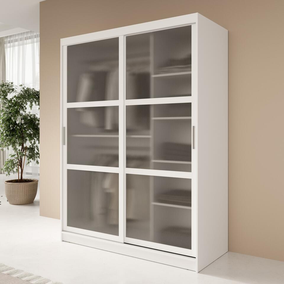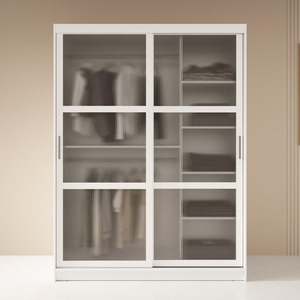 Kledingkast Fessaro beschikt over 2 schuifdeuren die openen met zilverkleurige handgrepen. De deuren zijn voorzien van geribbeld glas wat de kast een luxe en chique uitstraling geeft. In de binnenkant vind je 5 opbergvakken en 2 kledingroedes. Het meubel wordt ongemonteerd geleverd. Je dient het dus met behulp van de bijgeleverde handleiding zelf in elkaar te zetten.