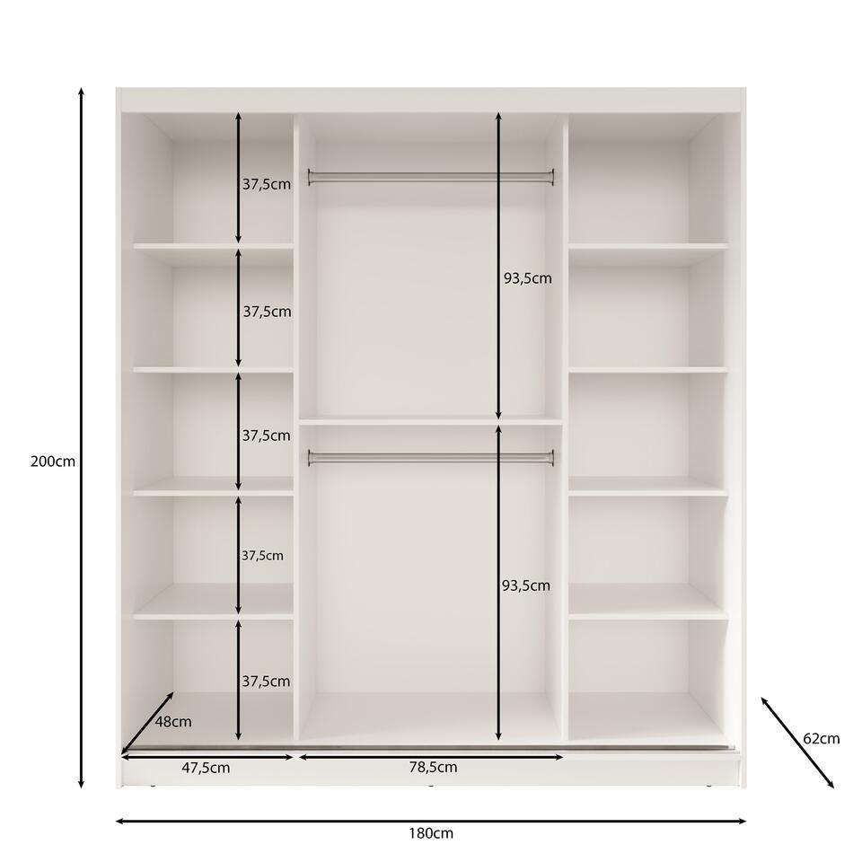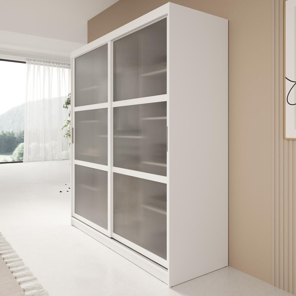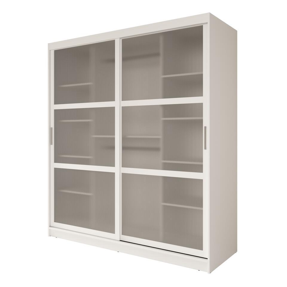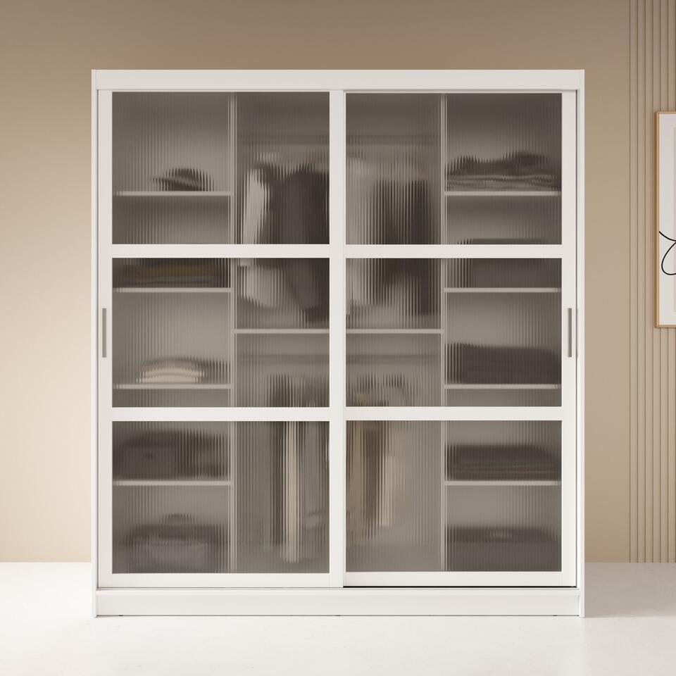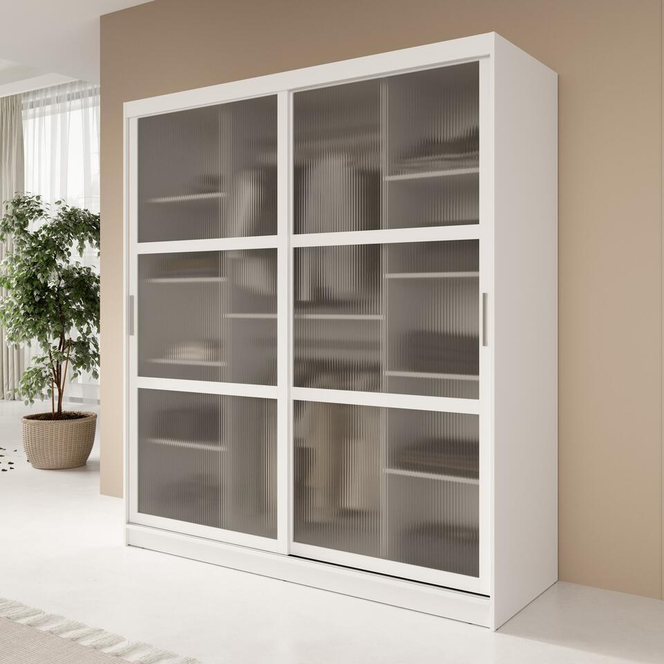 Kledingkast Fessaro beschikt over 2 schuifdeuren die openen met zilverkleurige handgrepen. De deuren zijn voorzien van geribbeld glas wat de kast een luxe en chique uitstraling geeft. In de binnenkant vind je 10 opbergvakken en 2 kledingroedes. Het meubel wordt ongemonteerd geleverd. Je dient het dus met behulp van de bijgeleverde handleiding zelf in elkaar te zetten.