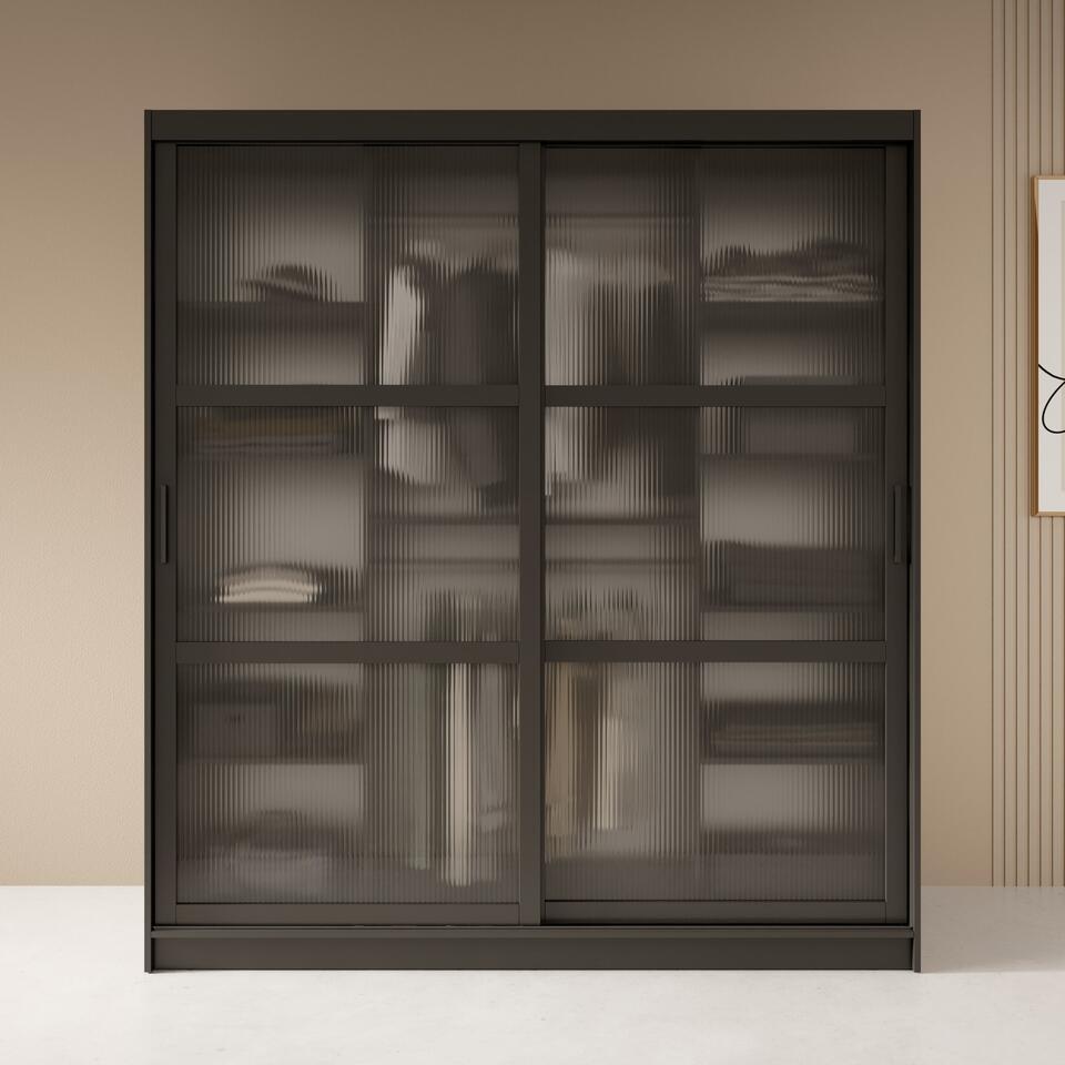 Kledingkast Fessaro beschikt over 2 schuifdeuren die openen met zwarte handgrepen. De deuren zijn voorzien van geribbeld glas wat de kast een luxe en chique uitstraling geeft. In de binnenkant vind je 10 opbergvakken en 2 kledingroedes. Het meubel wordt ongemonteerd geleverd. Je dient het dus met behulp van de bijgeleverde handleiding zelf in elkaar te zetten.