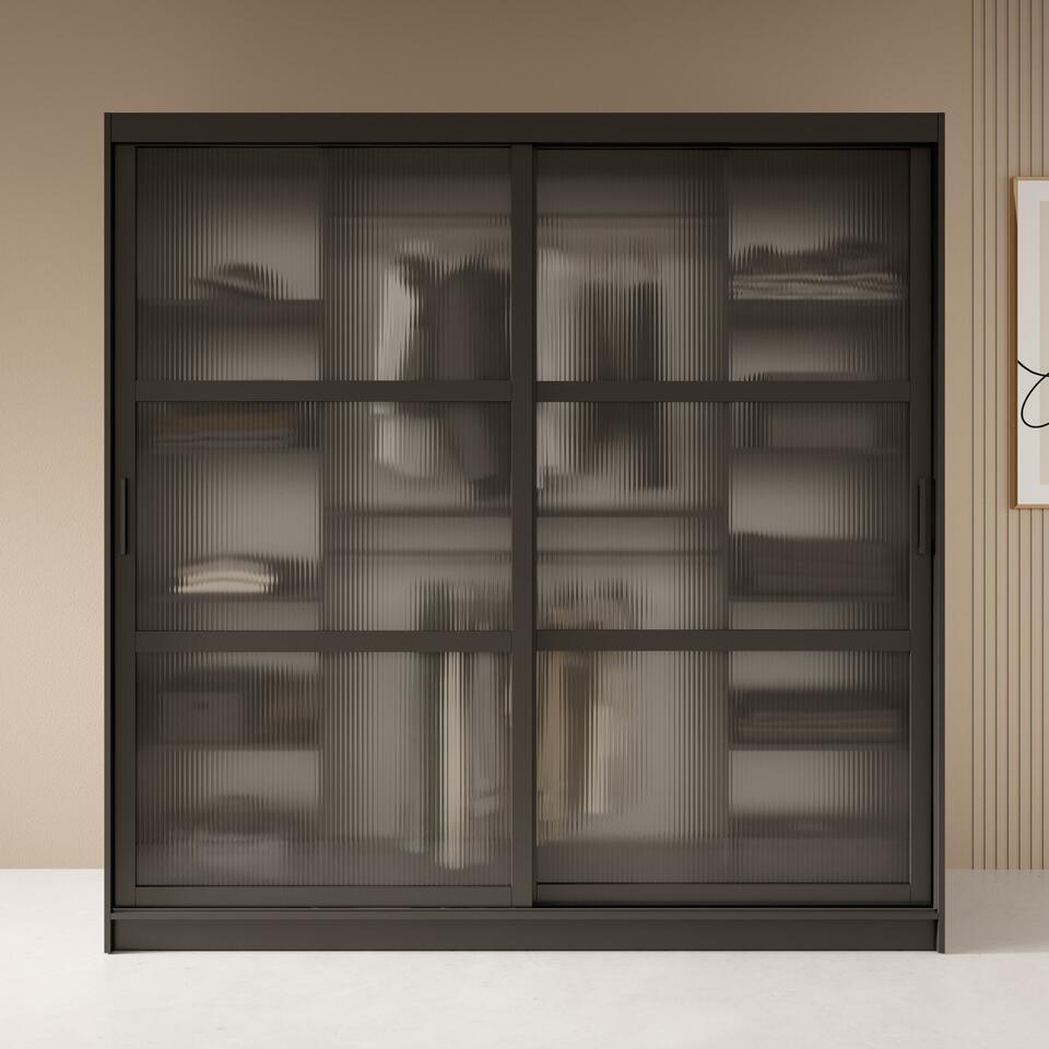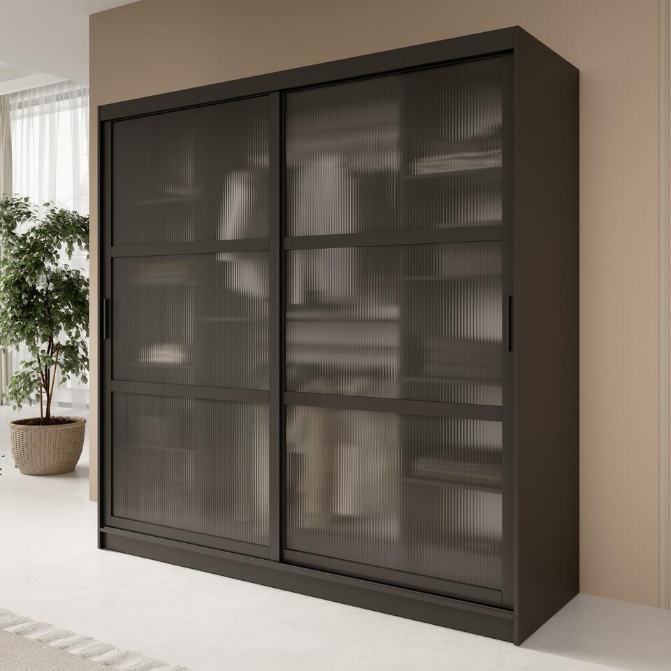 Kledingkast Fessaro beschikt over 2 schuifdeuren die openen met zwarte handgrepen. De deuren zijn voorzien van geribbeld glas wat de kast een luxe en chique uitstraling geeft. In de binnenkant vind je 10 opbergvakken en 2 kledingroedes. Het meubel wordt ongemonteerd geleverd. Je dient het dus met behulp van de bijgeleverde handleiding zelf in elkaar te zetten.