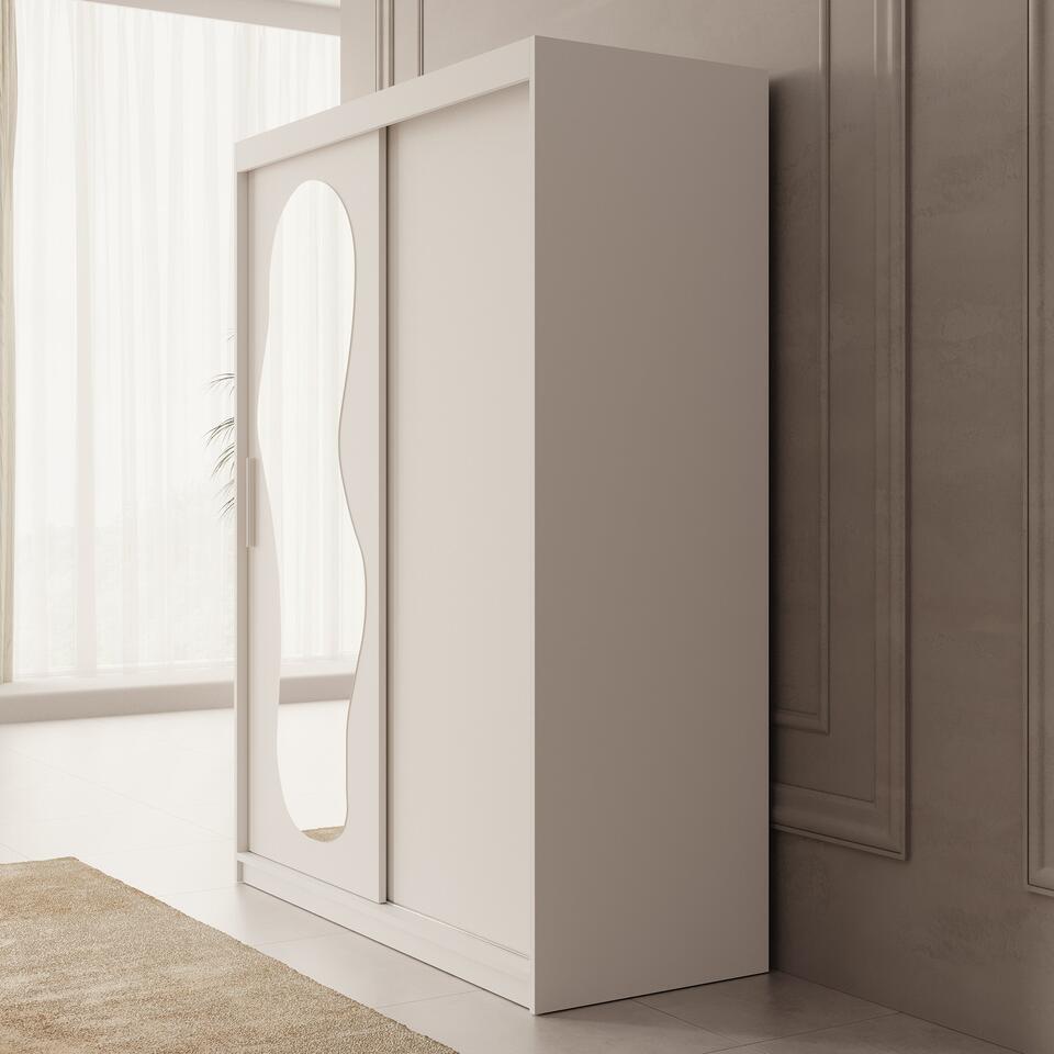 Kledingkast Ulysses beschikt over 2 schuifdeuren die openen met zilverkleurige handgrepen. De linkerdeur is voorzien van een speelse spiegel. De binnenkant bestaat uit 5 opbergvakken en 2 kledingroedes. De kast is uitgevoerd in witte kleur. Het meubel wordt ongemonteerd geleverd. Je dient het dus met behulp van de bijgeleverde handleiding zelf in elkaar te zetten.