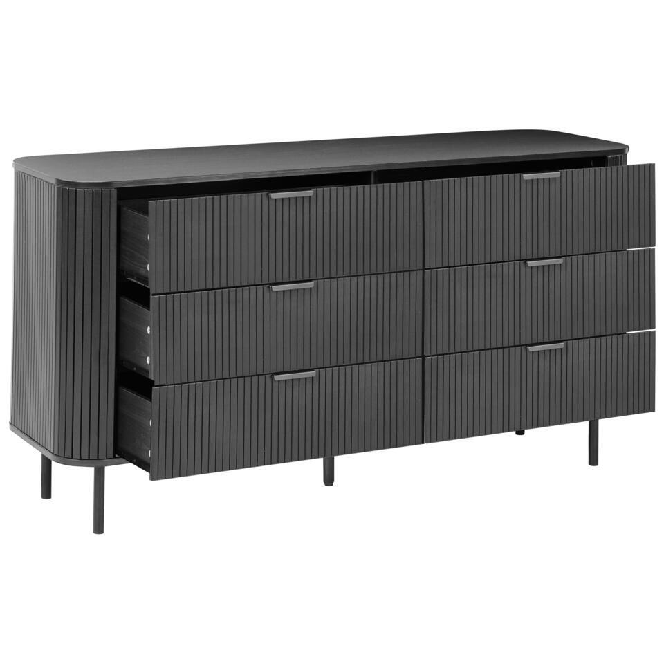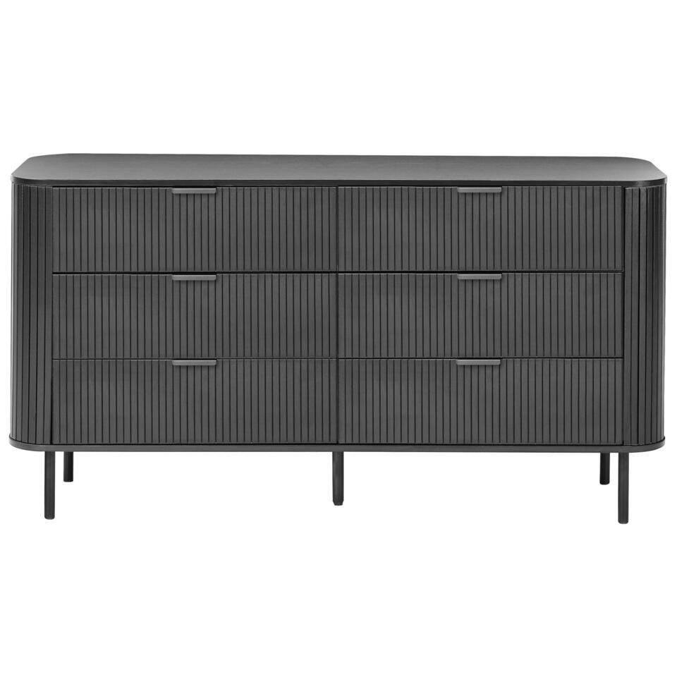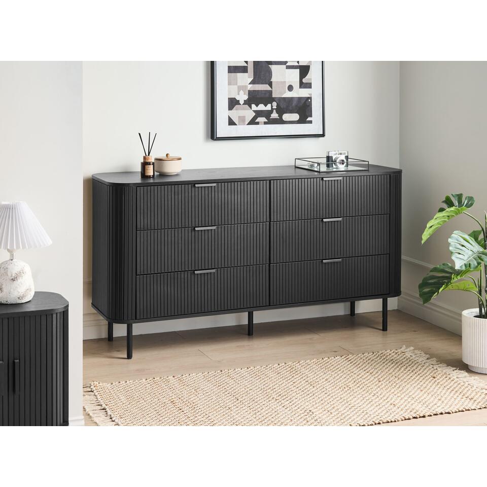 Retro kast met 6 lades. Versier je woonruimte met deze ladekast en organiseer de kamer dankzij het ontwerp. Dit chique meubel heeft 6 lades, perfect als opbergruimte voor je slaapkameraccessoires, kleding en andere benodigdheden, en zorgt zo voor een opgeruimde kamer. Het retro design van het meubel, gecombineerd met de zwarte tint en zwarte poten, zorgen ervoor dat het opvalt en past bij verschillende interieurstijlen. Bovendien garanderen de hoogwaardige materialen die voor de constructie zijn gebruikt - MDF voor de kast - niet alleen eenvoudig onderhoud, maar ook blijvende duurzaamheid, waardoor het een praktische en stijlvolle toevoeging aan je huis is.
