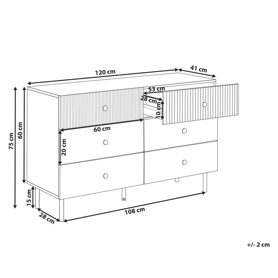Moderne opberger met laden. Deze minimalistische ladekast is een eenvoudige maar stijlvolle toevoeging aan elke slaapkamer of woonkamer. Het strakke ontwerp en de diepe lades bieden voldoende ruimte voor kleding, linnengoed en andere spullen. De zes lades bieden georganiseerde opbergoplossingen. De minimalistische esthetiek gecombineerd met geribbelde fronten op de bovenste lades voegt een vleugje moderne elegantie toe aan je ruimte.