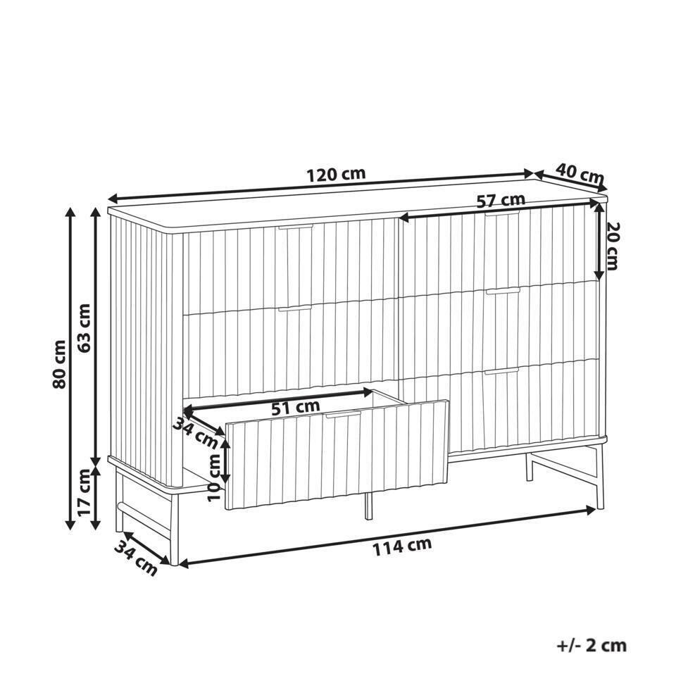 Moderne kast met laden. Deze ruime ladekast met 6 lades combineert modern design met praktisch nut en biedt voldoende opbergruimte voor kleding en andere benodigdheden. De kast en ladefronten zijn gemaakt van duurzaam MDF, een onderhoudsvriendelijk materiaal dat gemakkelijk schoon te maken is en geschikt voor dagelijks gebruik. Het dressoir wordt ondersteund door slanke ijzeren poten, wat zorgt voor een uitstekende stabiliteit en een eigentijdse uitstraling. Het heeft een stijlvolle geribbelde textuur die een vleugje elegantie toevoegt aan elke kamer. De laden glijden soepel voor gemakkelijke toegang, terwijl de kwaliteitsmaterialen zorgen voor duurzame prestaties met minimaal onderhoud. Dit dressoir is perfect voor slaapkamers of woonkamers en biedt zowel functionaliteit als verfijnde stijl.