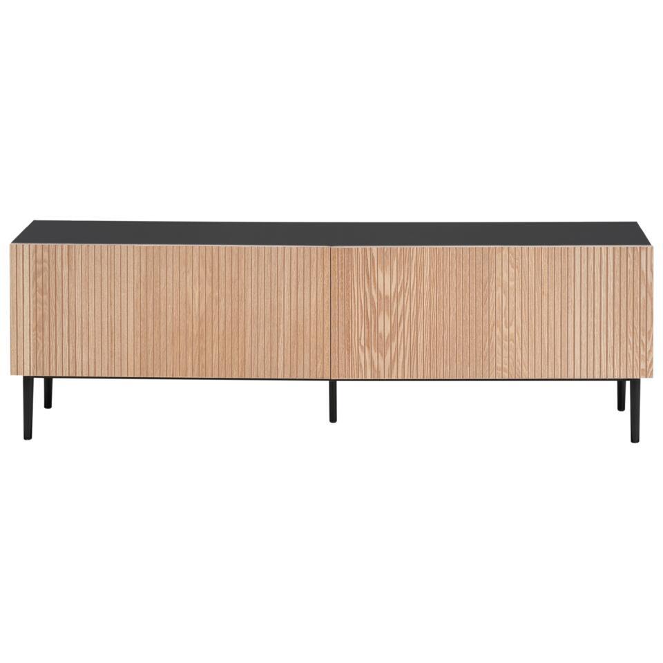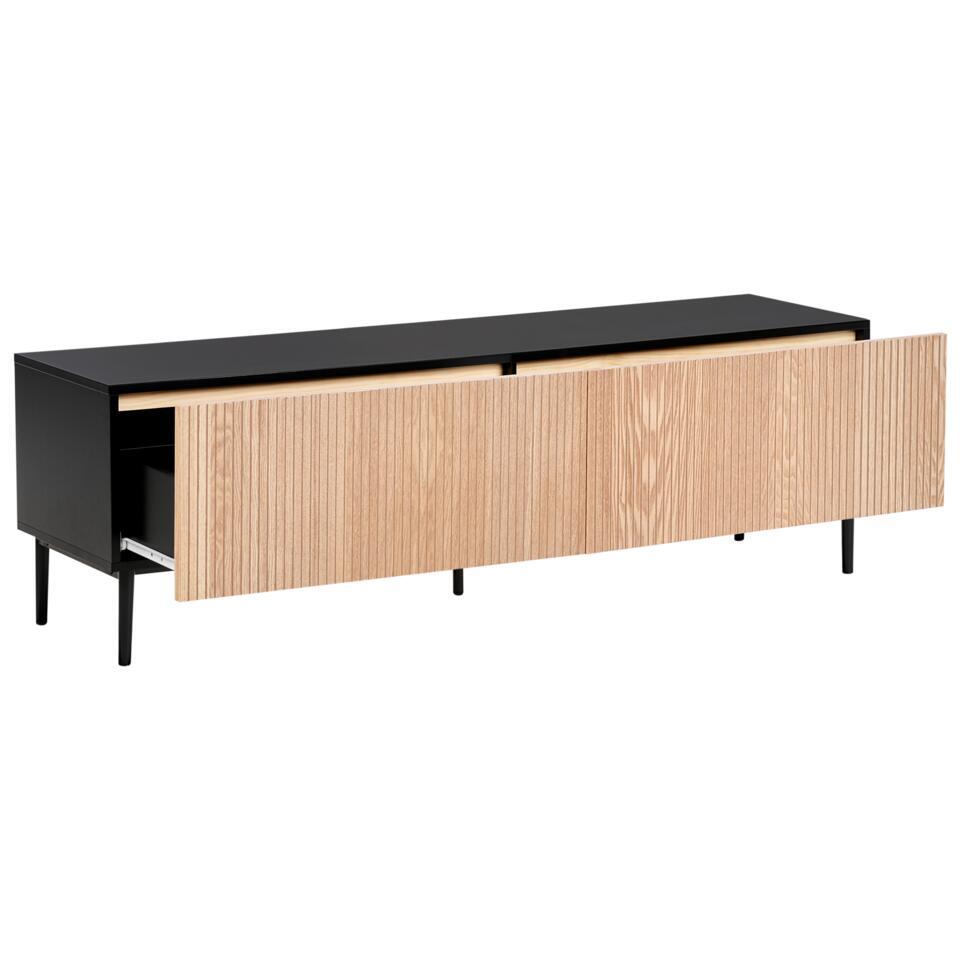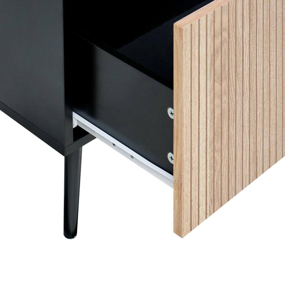 Moderne tv-kast met geribbelde voorkant. Dit moderne TV-meubel is een perfect meubelstuk voor elke woonkamer. Met 2 ruime lades is het een geweldige extra opbergruimte. Het meubel is gemaakt van lichtgewicht MDF met slanke hoge metalen poten en is duurzaam en functioneel. De kast voegt elegantie toe aan elke woonkamer dankzij de klassieke zwarte kleur en de stijlvolle essenhouten fineer geribbelde voorkant.