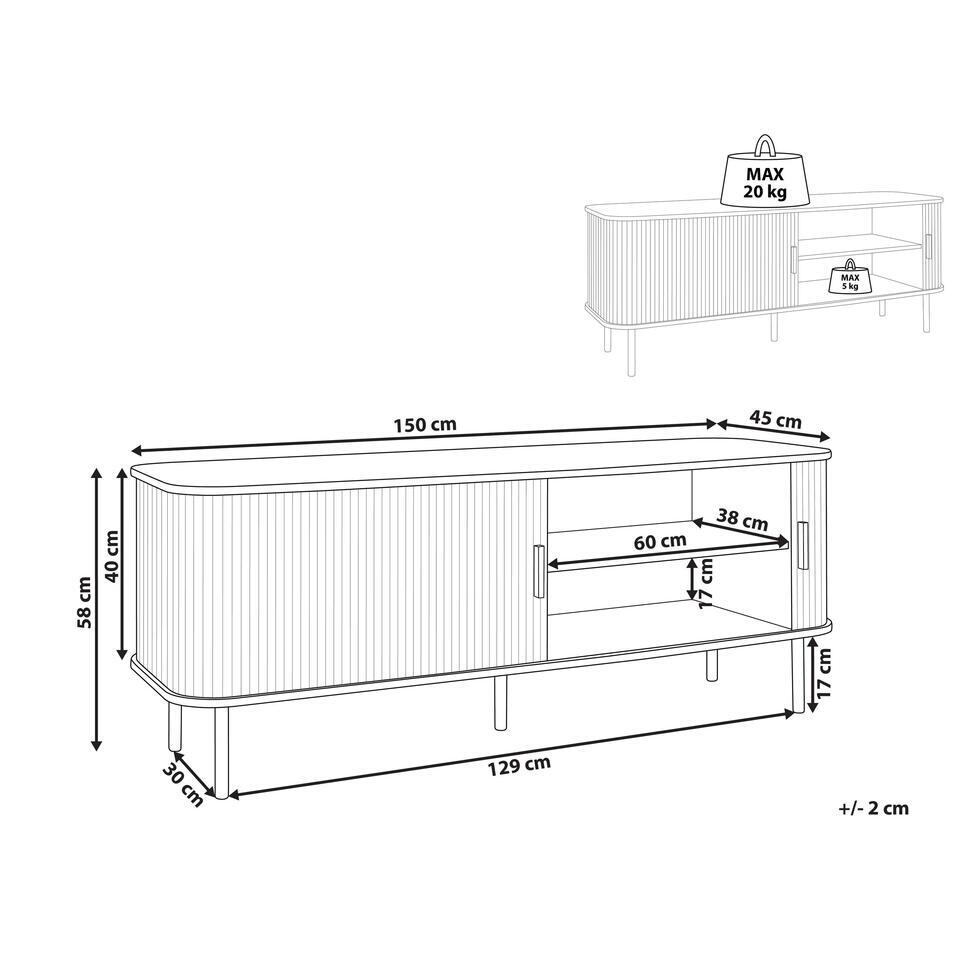 Retro TV-meubel met schuifdeur voor tv's tot 54''. Richt je kamer in met deze TV-standaard en organiseer de kamer dankzij het ontwerp. Dit chique meubel heeft twee slanke schuifdeuren met daarachter vier ruime planken die voldoende opbergruimte bieden voor je boeken, tv-accessoires en andere benodigdheden, zodat je een rommelvrije ruimte hebt. Uitgerust met vier kabelmanagementgaten houdt het moeiteloos al je kabels netjes geordend en uit het zicht. Het retro design van het meubel, gecombineerd met de lichte tint en zwarte poten, zorgen ervoor dat het opvalt en past bij verschillende interieurstijlen. De hoogwaardige materialen die voor de constructie zijn gebruikt, garanderen niet alleen eenvoudig onderhoud, maar ook duurzame duurzaamheid, waardoor het een praktische en stijlvolle toevoeging aan je interieur is.