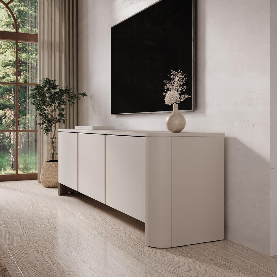 TV-Meubel Barbados is een modern tv-meubel in beige kleur. Het meubel heeft 3 deuren die openen met het push to open systeem. Hierachter zitten 3 opbergvakken. Het meubel heeft afgeronde hoeken wat zorgt voor een fraaie uitstraling. Het meubel wordt ongemonteerd geleverd. Je dient het dus met behulp van de bijgeleverde handleiding zelf in elkaar te zetten.