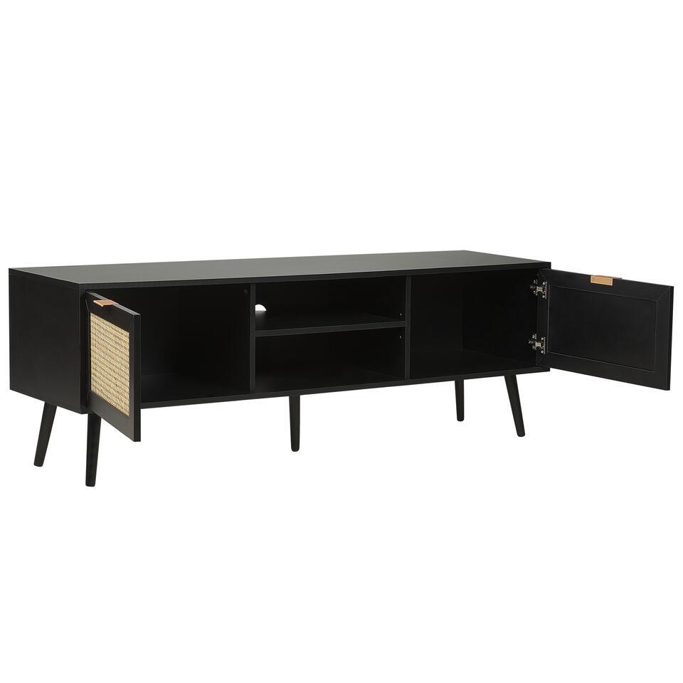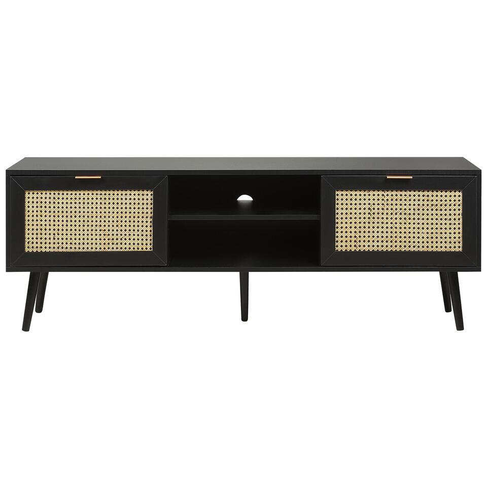 Tv opbergmeubel met rotan frontjes. Dit Tv-meubel is een perfecte aanvulling om je woonkamer af te maken. Hij is voorzien van twee ruime kasten, die voldoende opbergruimte bieden voor je entertainmentbenodigdheden en er toch strak uitzien. De open planken bieden een perfecte display voor je media-apparaten of decoratieve stukken, en een discrete kabeldoorvoer houdt je kabels georganiseerd en uit het zicht. De kast is ondersteund door stevige rubberen houten poten en versierd met elegante, gouden handgrepen, hierdoor combineert het meubel naadloos stijl en functionaliteit om elke woonkamer te verrijken.