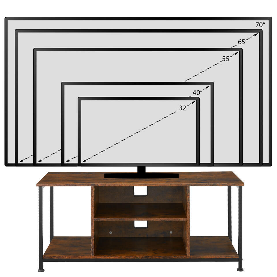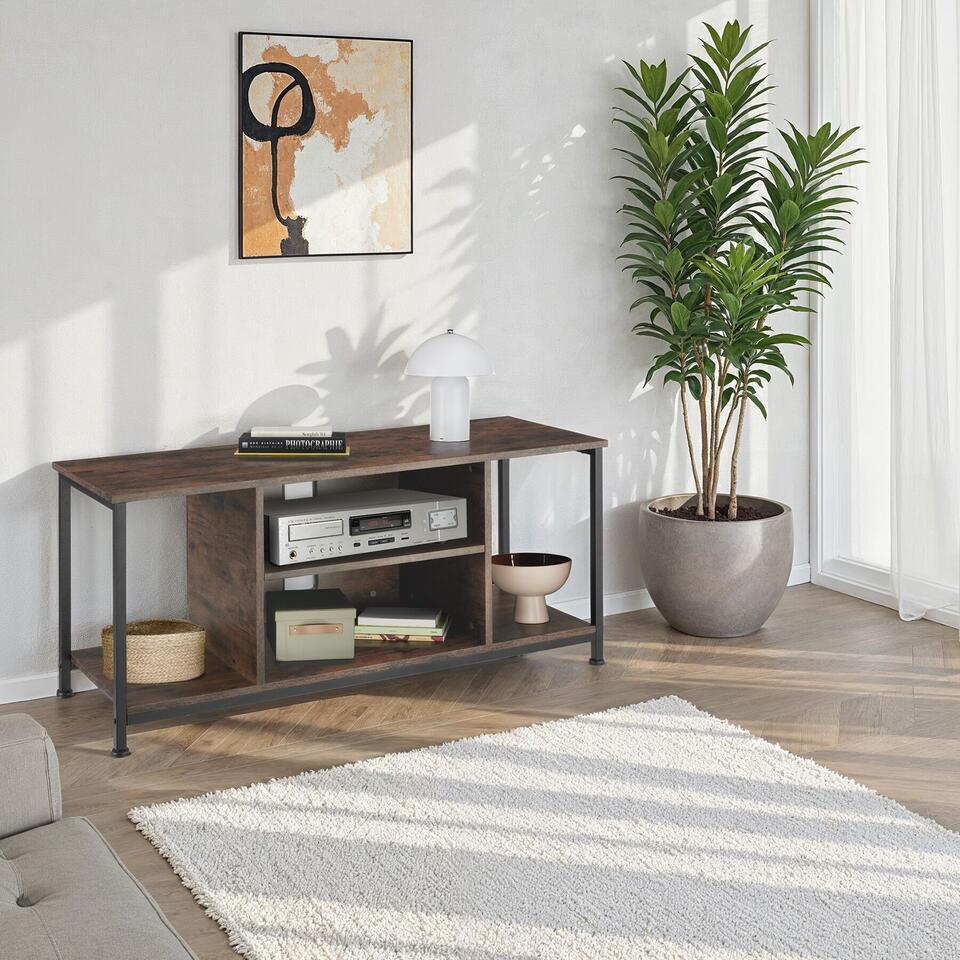 Het hoekige uiterlijk en het kleurcontrast tussen de warme houten oppervlakken en het koele metalen frame zijn de kenmerken van dit functionele tv-meubel met een typische industriële look. Vier open vakken bieden veel opbergruimte, waarbij de plank in het midden in drie verschillende hoogtes verstelbaar is. Dit tv-meubel heeft twee vierkante uitsparingen in de achterwand, dit zorgt voor een overzichtelijke kabelgeleiding. De beschermende melaminecoating, de goede veerkracht en de in hoogte verstelbare poten bieden vele voordelen in het dagelijks gebruik en dragen bij aan de lange levensduur van het stijlvolle tv-meubel.