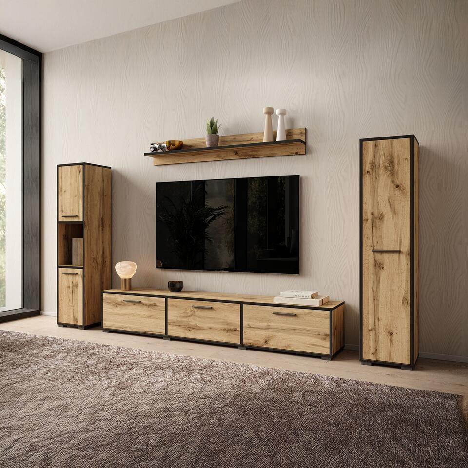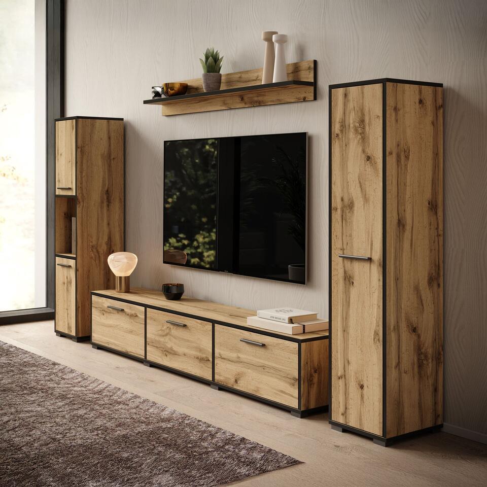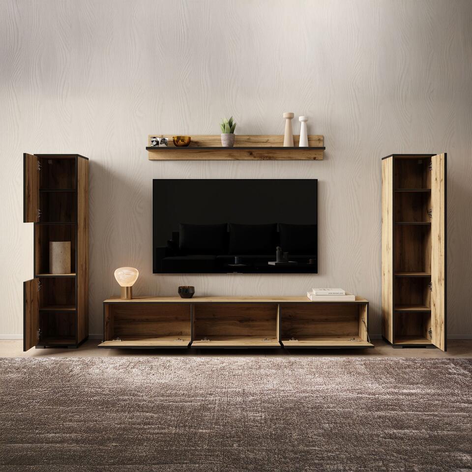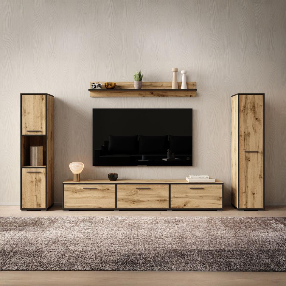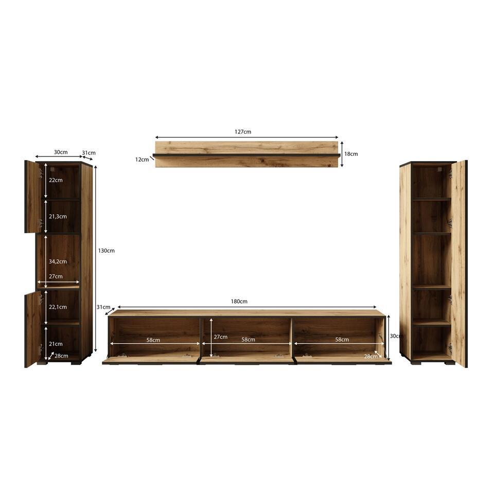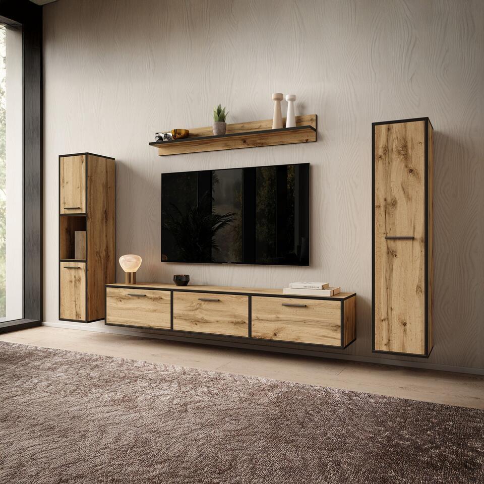 Wandmeubel Betty bestaat uit een tv-meubel, 2 opbergkasten en bijpassende wandplank. Dit model is zowel staand als hangend te monteren. De kast is uitgevoerd in een eiken kleur met zwarte randen. Het meubel wordt ongemonteerd geleverd. Je dient het dus met behulp van de bijgeleverde handleiding zelf in elkaar te zetten.