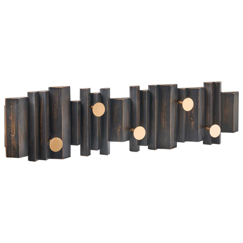 Handgemaakte kapstok voor in de hal. Geef je muren meer karakter met deze unieke wandkapstok. De kapstok is handgemaakt van dennenhout en heeft een donkere, verweerde afwerking die de natuurlijke textuur van het hout prachtig laat uitkomen. De verticale opstelling van blokken, gecombineerd met metalen haken in contrasterende goudkleur, biedt een stijlvolle manier om jassen, tassen of hoeden op te hangen. Met twee haken aan de achterkant voor eenvoudig bevestigen is dit meubel perfect om zowel praktisch als decoratief te zijn in je hal.