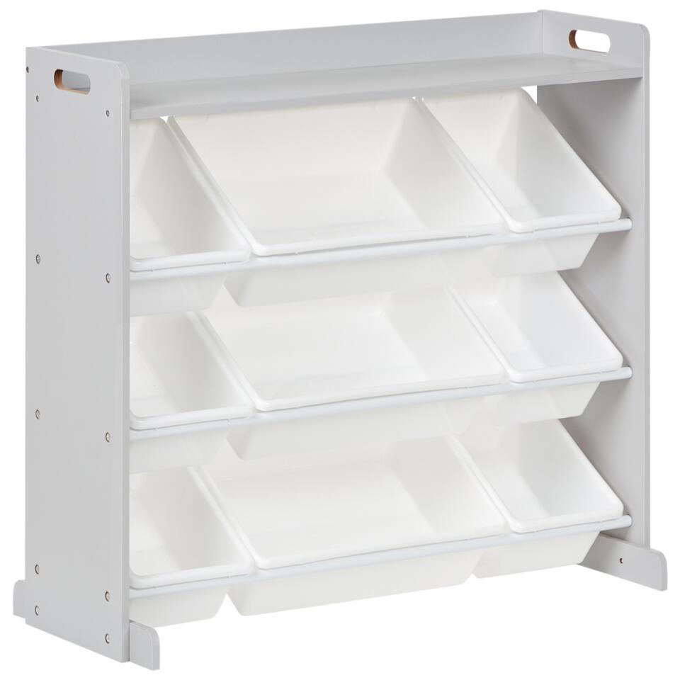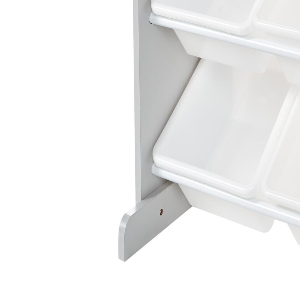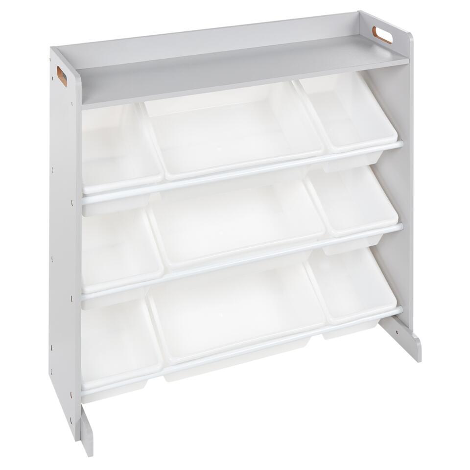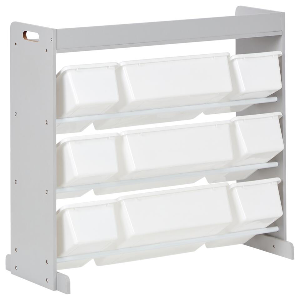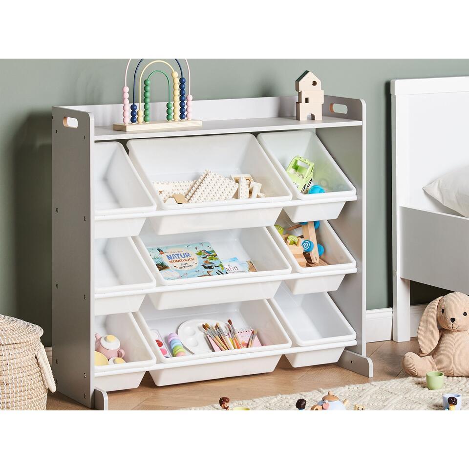 Kinderkamer kast met bakken. Maak de kinderkamer compleet met deze praktische opbergkast, ontworpen voor efficiënte organisatie. Het heeft negen plastic opbergdozen in verschillende maten, zodat je speelgoed, boeken en accessoires gemakkelijk kunt sorteren. Het open ontwerp zorgt voor snelle toegang, terwijl de stevige, eenvoudig te reinigen constructie zorgt voor duurzaamheid en eenvoudig onderhoud. De veelzijdige stijl maakt het geschikt voor verschillende kinderkamers.