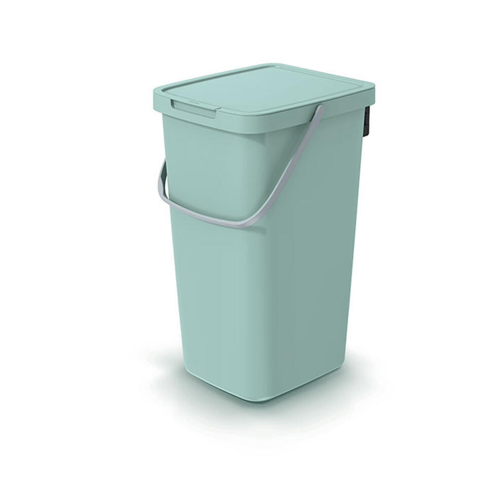 Sorteer of GFT afval scheiden prullenbak of afval emmer voor in de keuken of op/naast het aanrecht. Voorzien van afsluitbare deksel en hengsel. Ruim compartiment van 25 Liter. Kleur: mintgroen. Afmetingen: 26 x 29 x 48 cm. Op te hangen met bijleverde beugel.