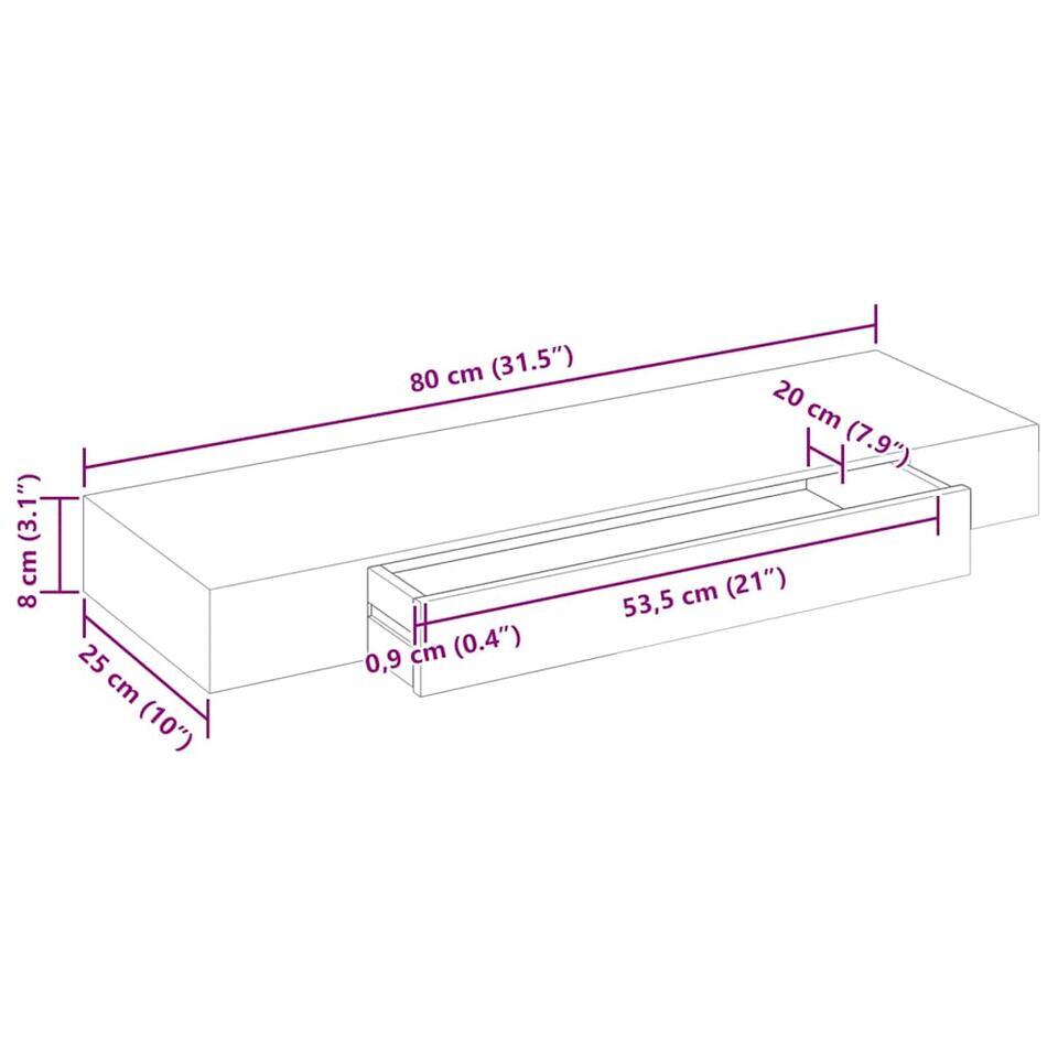 - Afmetingen schap: 80 x 25 x 8 cm (B x D x H)