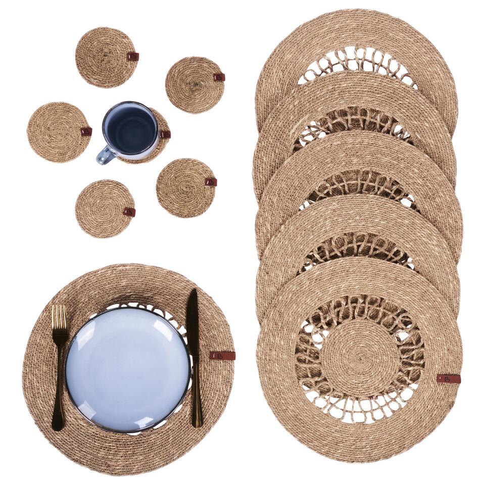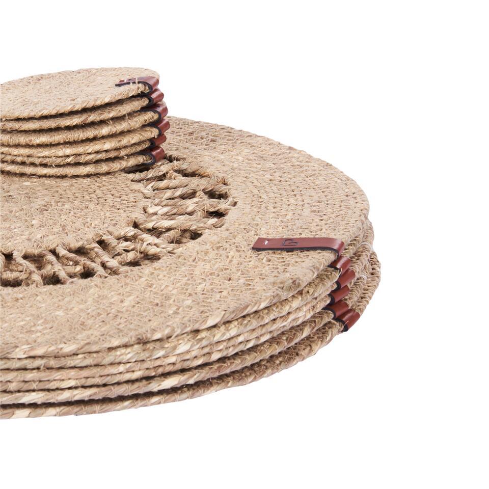 Set van ronde handgemaakte placemats en onderzetters. Haal de schoonheid van de rustieke stijl in huis met deze stijlvolle placemats en onderzetters van zeegras. Ze zijn handgeweven van natuurlijk zeegras en voegen een vleugje boho-achtige charme toe aan je eettafel. Het unieke, getextureerde ontwerp en natuurlijke kleurenpalet passen bij elke interieurstijl.