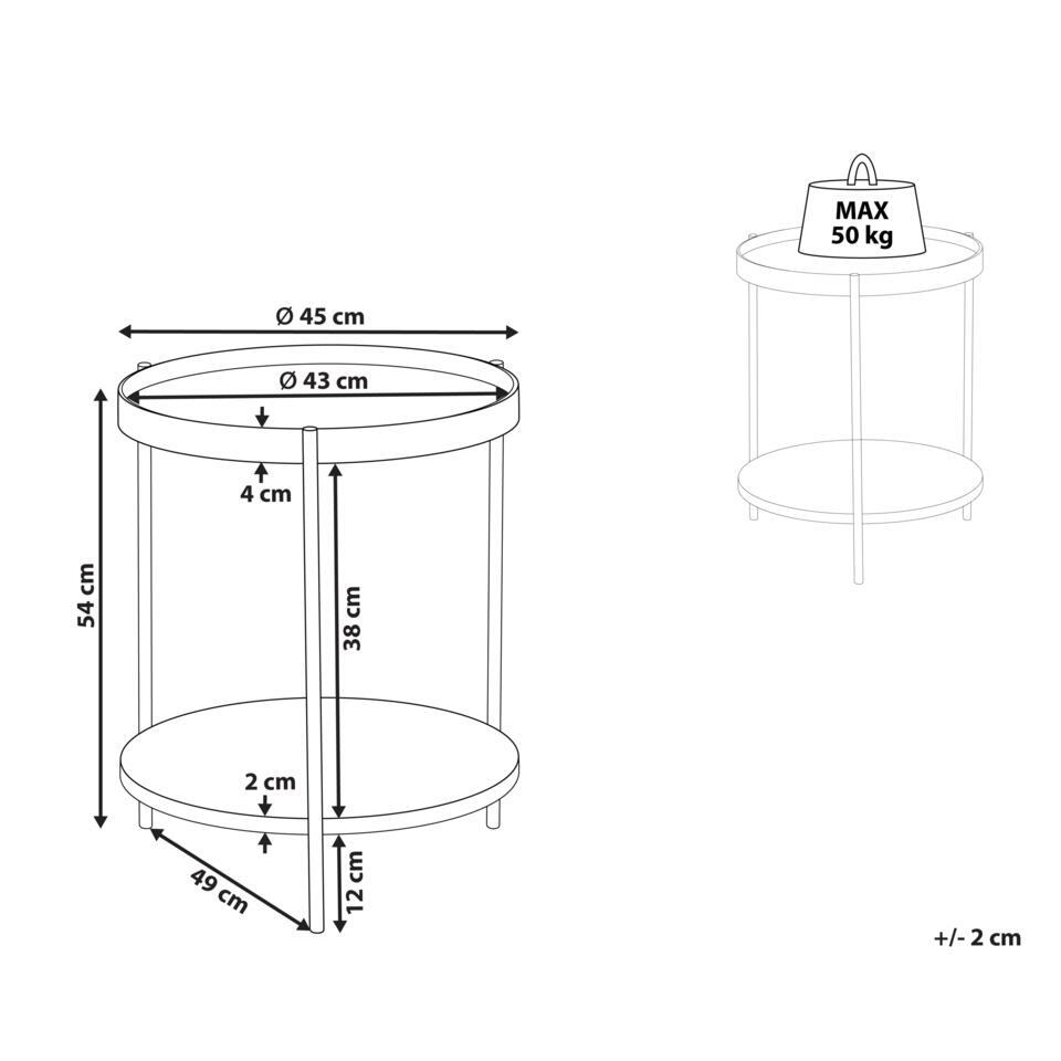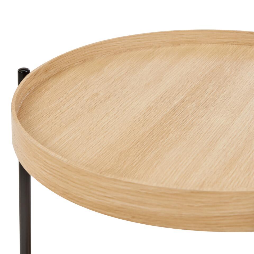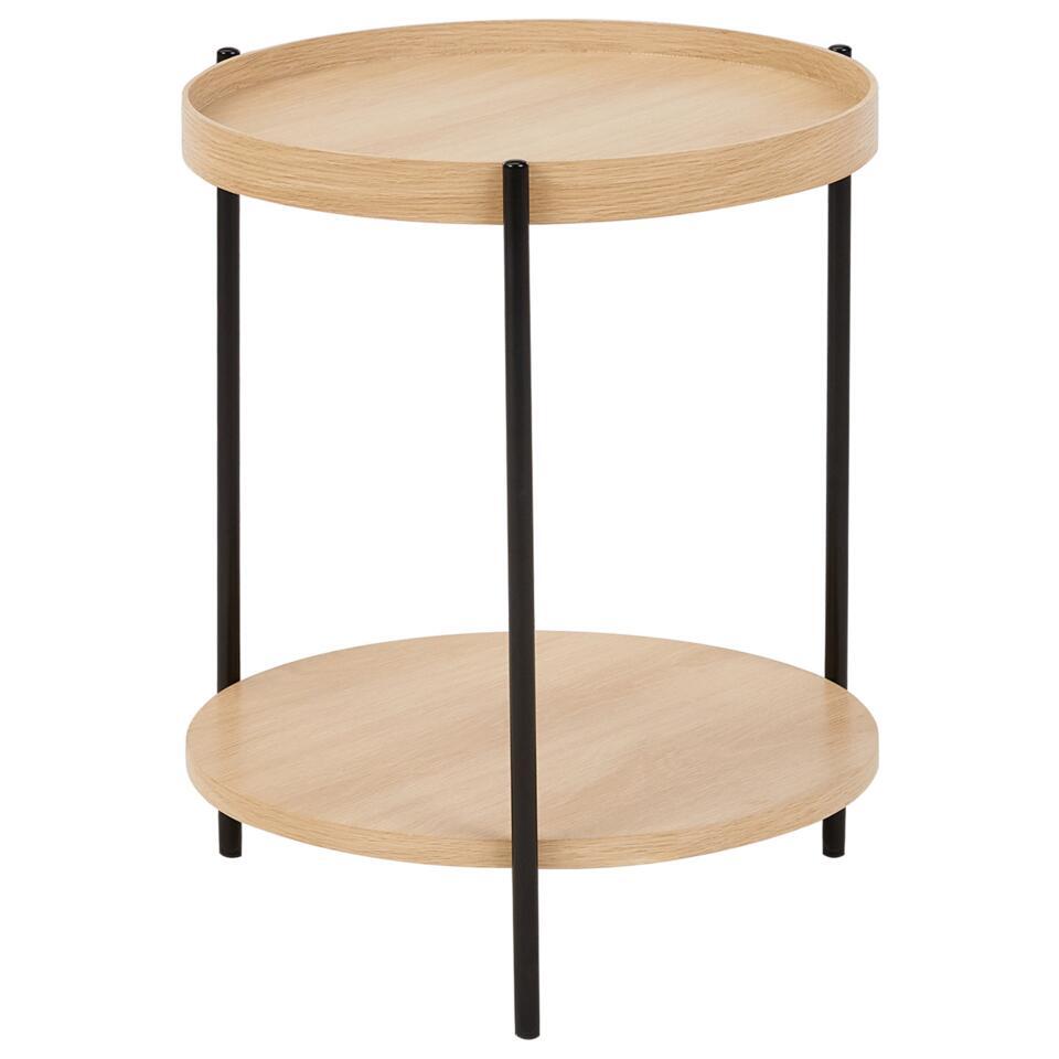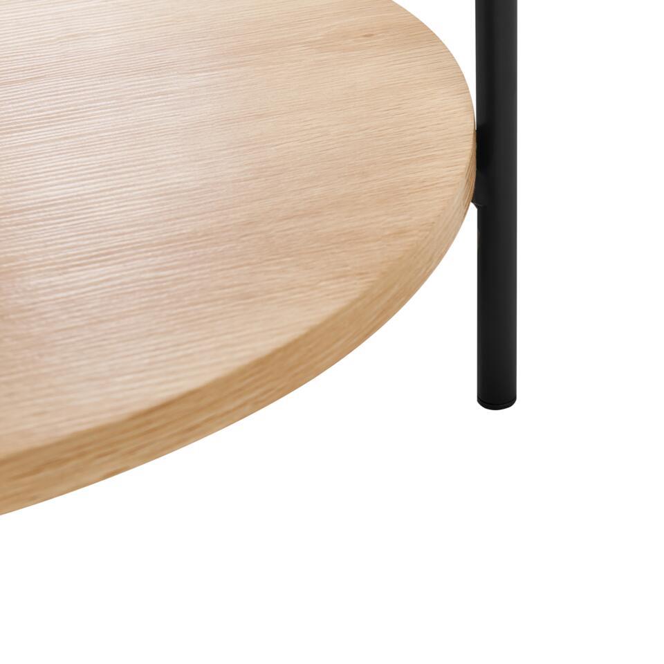 Decoratieve bijzettafel. Deze ronde bijzettafel combineert natuurlijke charme met modern design. Het blad heeft een dienbladachtige vorm, waarbij zowel de bovenste als de onderste plank een natuurlijk ogend houteffect hebben voor extra warmte en textuur. Het stevige zwart metalen frame zorgt voor stabiliteit en stijl, terwijl kunststof doppen je vloer beschermen tegen krassen. Deze veelzijdige tafel is perfect voor het opbergen van benodigdheden of het uitstallen van decoratieve items en voegt een vleugje natuurlijke elegantie toe aan elke woonruimte.