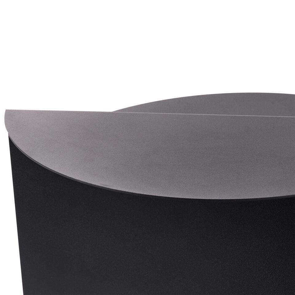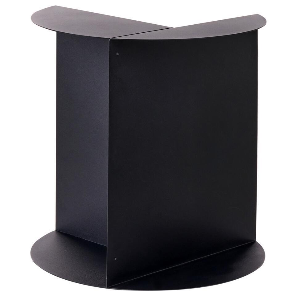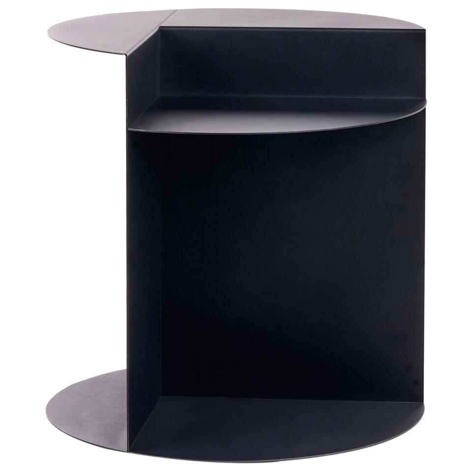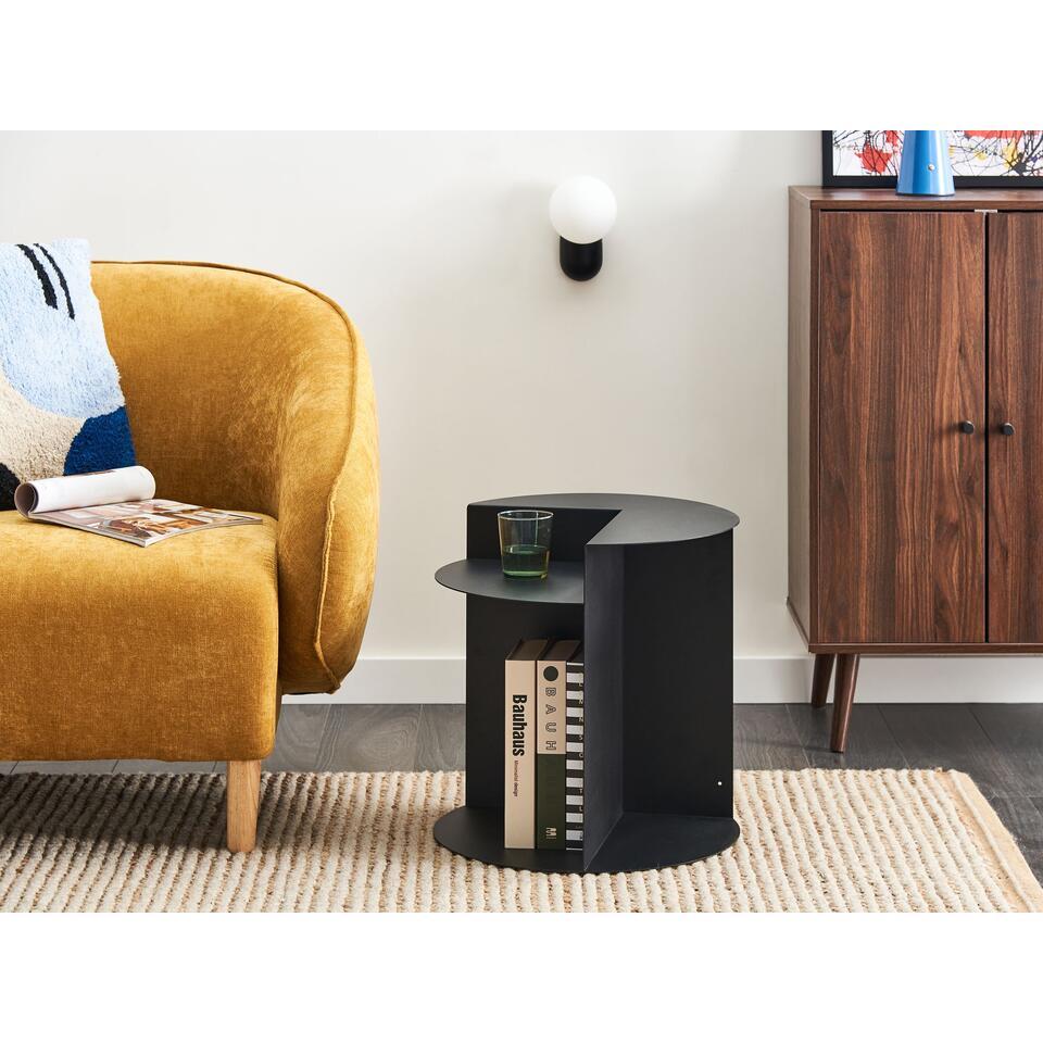 Accent tafeltje. Deze design bijzettafel geeft elke woonruimte een speciaal tintje met zijn ronde, geometrische vorm en strakke, moderne lijnen. De tafel is aan één kant open en is zowel stijlvol als praktisch - perfect voor het opbergen van boeken en meer op de ingebouwde planken. De stevige metalen tafel past perfect naast een bank of fauteuil en biedt precies de juiste mix van functionaliteit en flair.